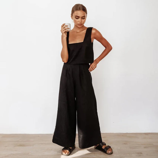 Embody timeless elegance with our Eloise - Flowing Wide Trousers with Matching Tank Top, comprising an elegant sleeveless black top and wide-leg trousers that drape beautifully for a flattering silhouette. The lightweight, breathable fabric ensures comfort and freedom of movement, making this ensemble suitable for both casual and semi-formal occasions.