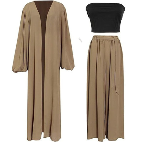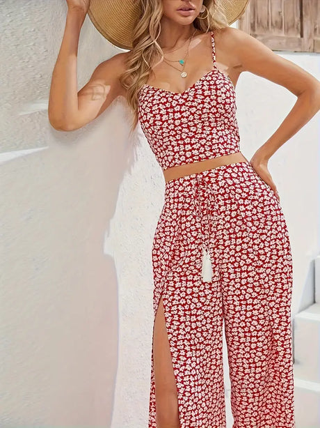 Crop Cami Top With V-Neck and Split Trousers With Waist Belt, Two-piece Set