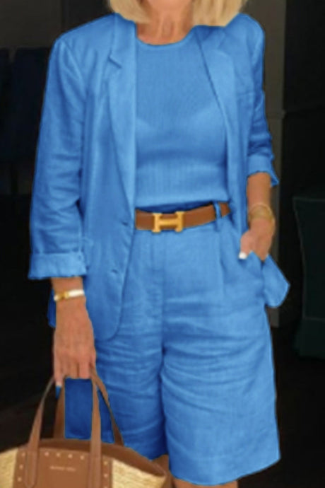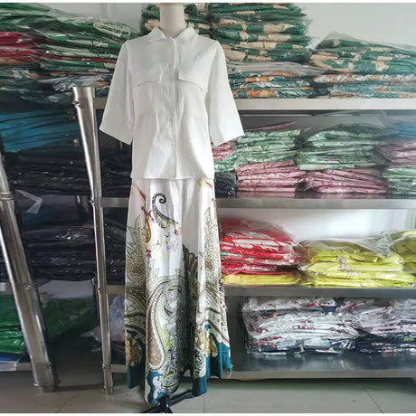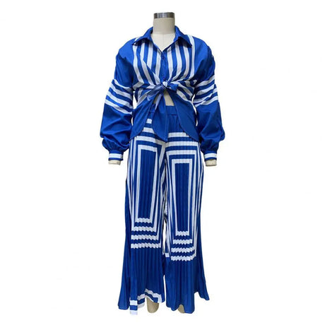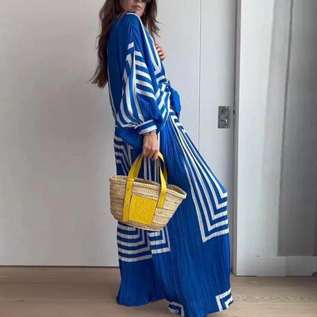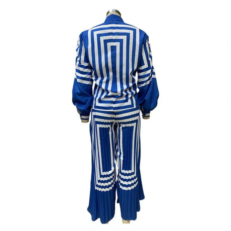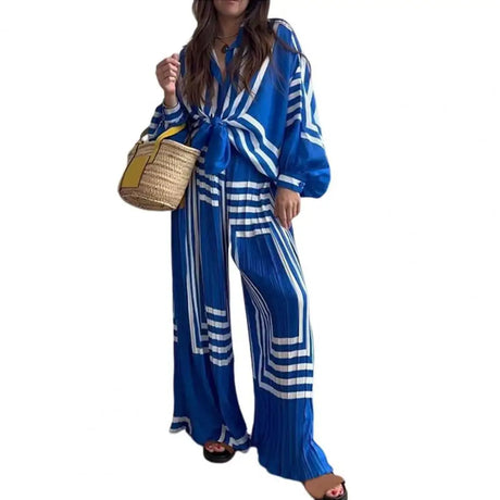 Vintage Set With Long Sleeves, Button-down Blouse and Loose Straight Trousers For Women