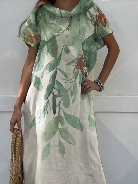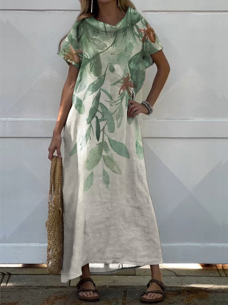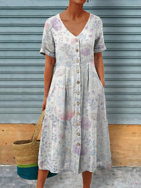 Women's Vintage Floral Leaves Watercolor Art Print Casual V-Neck Linen Pocket Dress