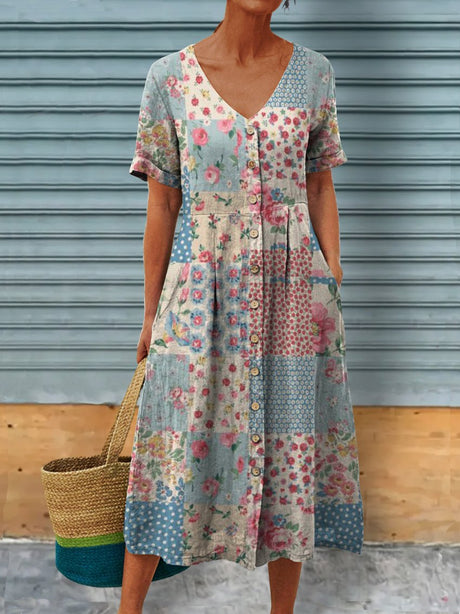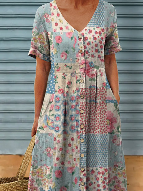 Women's Vintage Lrregular Patchwork Flowers Art Print Linen Pocket Dress