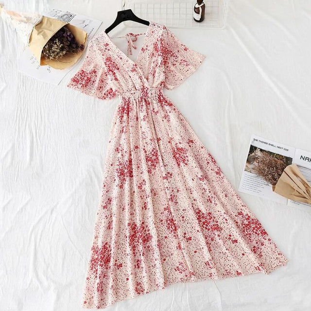 Clarissa - Elegant floral print midi dress - Red / XS is backordered and will ship as soon as it is back in stock.