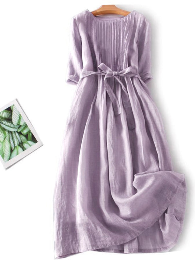 Cotton And Linen Lace Up Three Quarter Sleeve Solid Color Dress