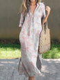 Fresh and Elegant Pink Floral Print Women's V-Neck Linen Pocket Dress