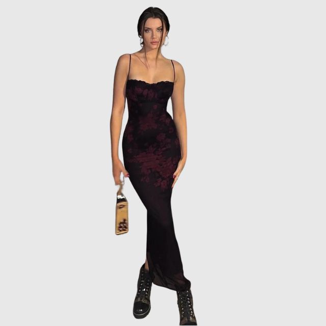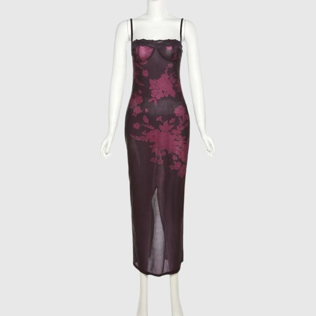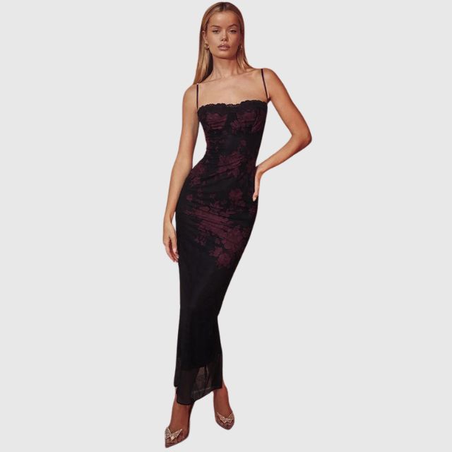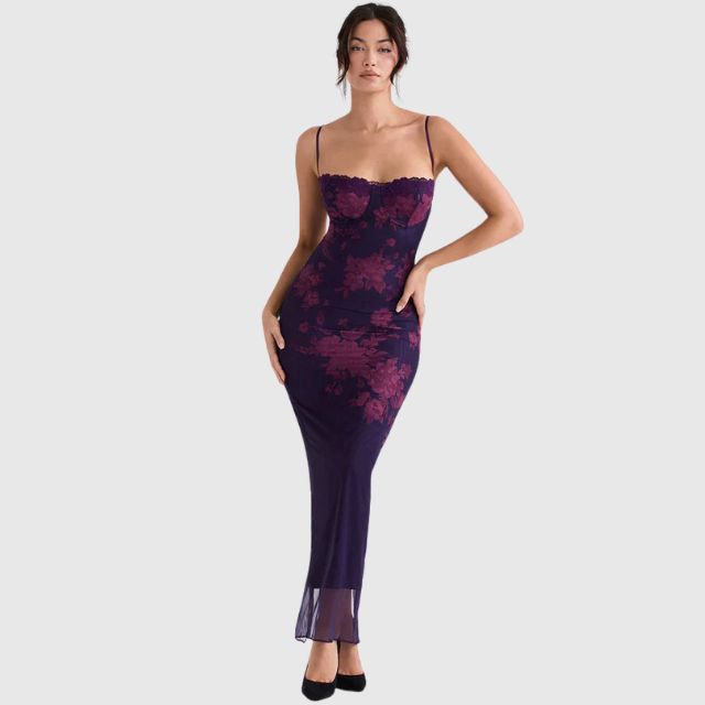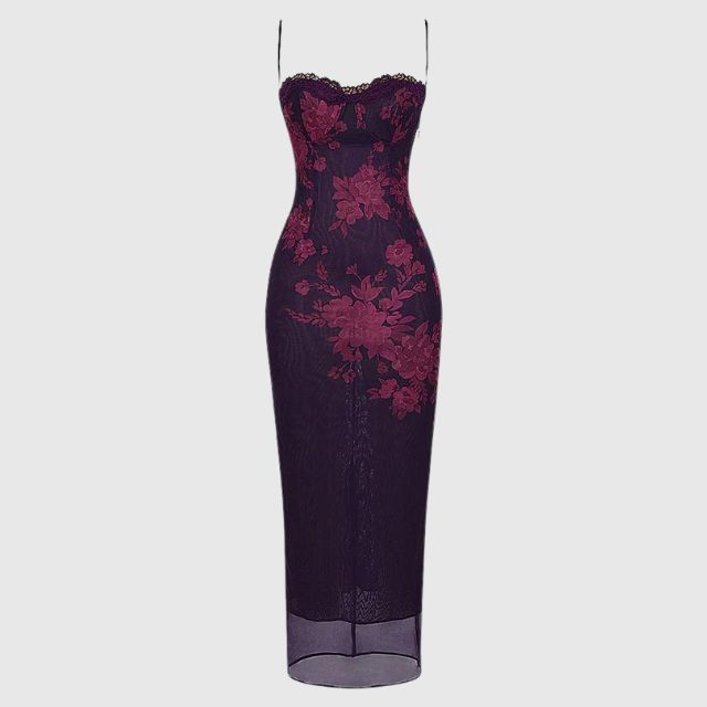 Embrace elegance with this Freya - Floral sheath dress with sheer hem. With a wrapped bust design and delicate straps, this dress showcases an alluring open back and a slim silhouette that gently caresses your curves. The deep midnight tones and sophisticated floral lace print make it the ideal choice for upscale clubwear or evening events. Step into the spotlight with this enchanting and sexy ensemble.