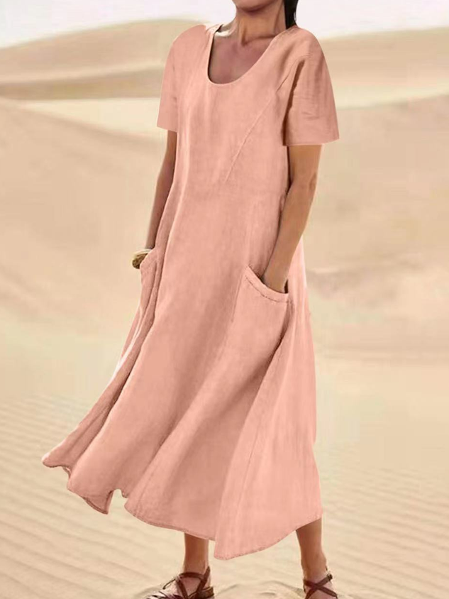 JFN Cotton & Linen Solid Color Loose Casual Pocket Dress