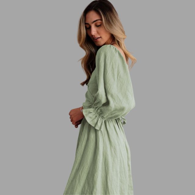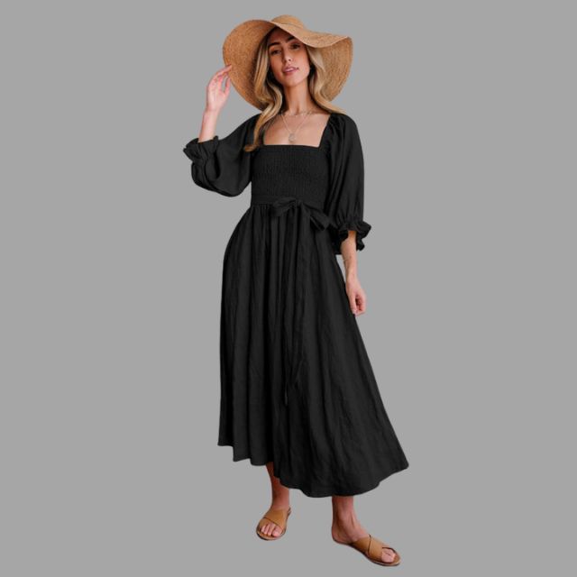This Sofia midi dress with a smocked top and balloon sleeves features a reversible design that adds a touch of versatile elegance to any woman's wardrobe. The cute puff sleeves and lace-up detailing emphasise the waist, while the elasticated skirt flows effortlessly to a long, graceful hemline. It's a versatile piece that exudes simplicity and elegance and is ideal for those looking for a chic but comfortable fashion statement.