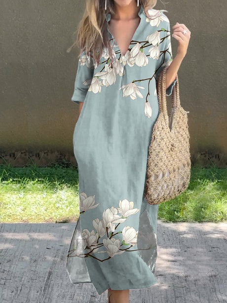 White Magnolia Floral Art Printed Women's V-Neck Linen Pocket Dress