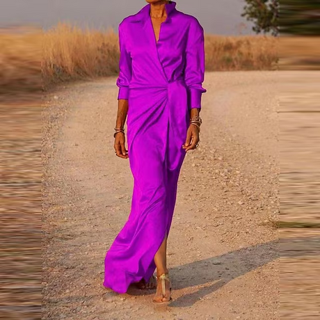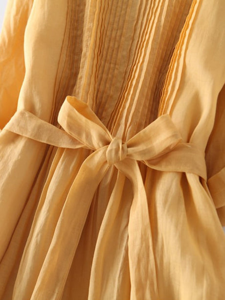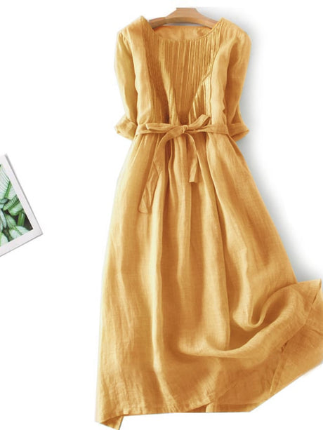 Cotton And Linen Lace Up Three Quarter Sleeve Solid Color Dress