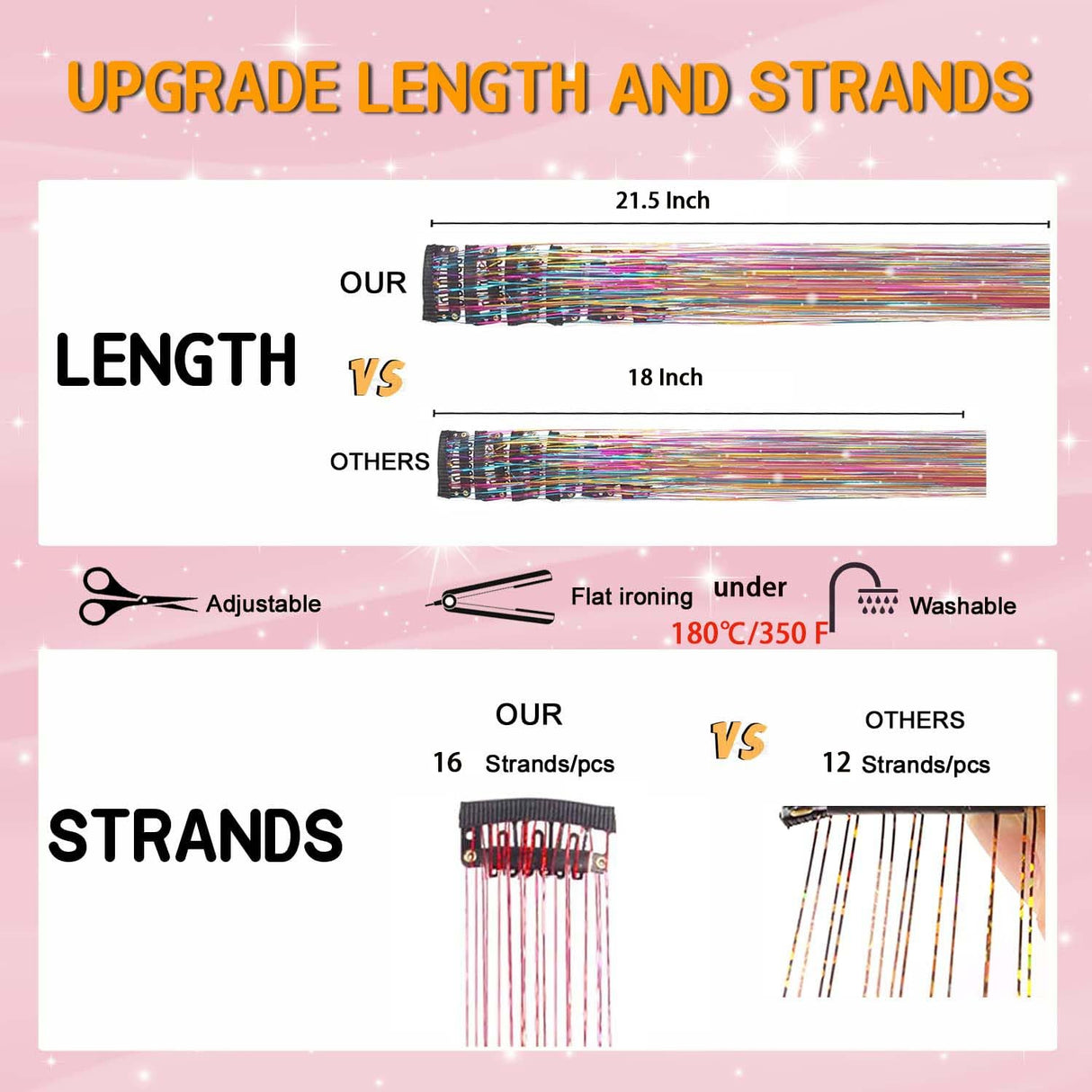 - 【Specifications】- There are 12 pieces fairy glitter hair tinsel in the package, about 21.5in in length. You can trim the extra as you want.