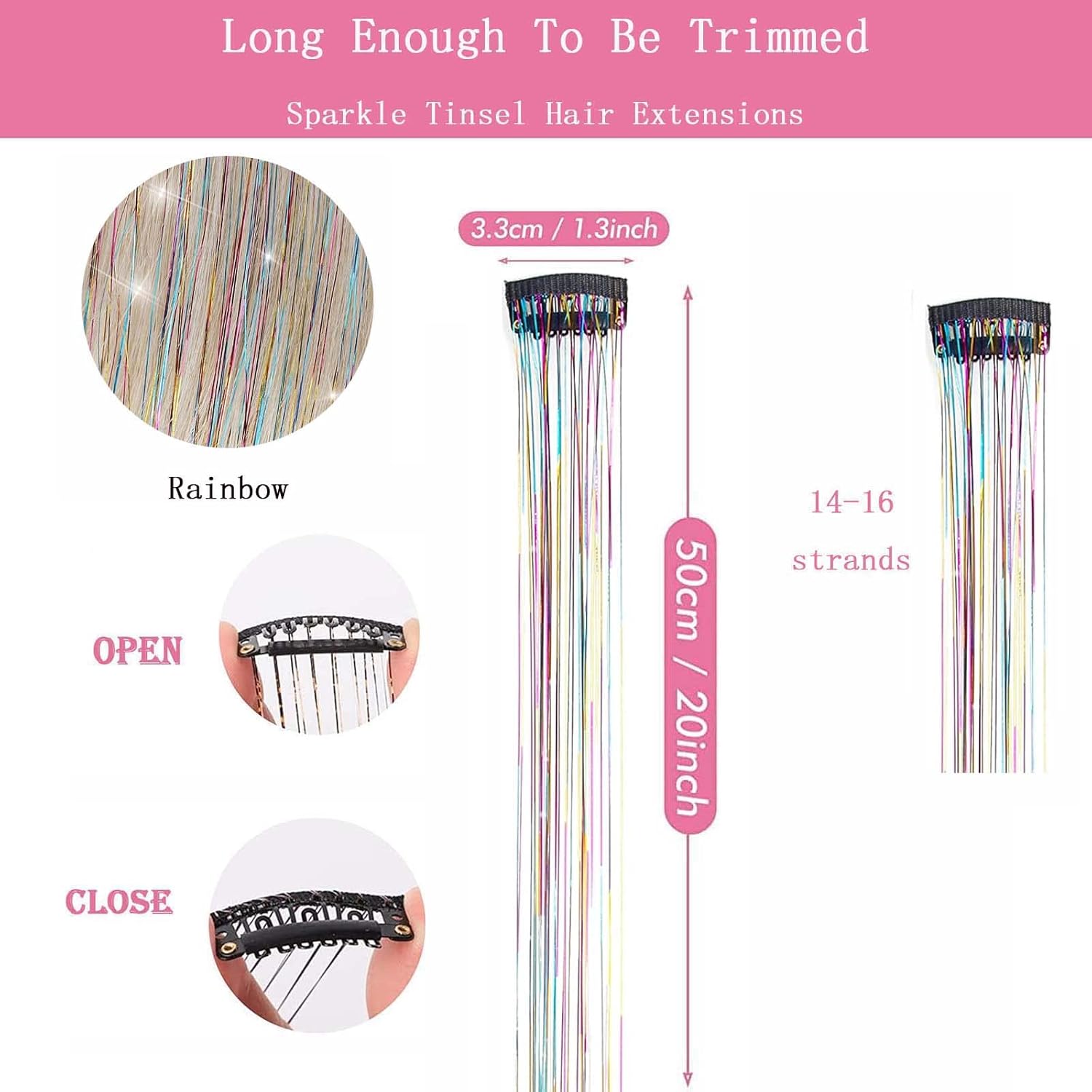 - 【Instant Shine】- Compared with traditional hair tinsel kit, the clip in hair tinsel extensions is the fastest and easiest way to add color and glitter on your hair without tools and the hairdresser's help, just half a minute.