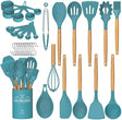 - 33 DURABLE WOODEN HANDEL KITCHEN UTENSILS SET: Anti scalding protect your hand from burning, 33 professional silicon Kitchen utensil set includeshe set includes flexible spatula, soup ladle,serving spoons pasta server, spatula turner , tongs, mesuring cup and spoons, 10 hooks, silicone mat and so on. Meet your all kinds of kitchen needs, Because of the wooden handle, We don't recommend soaking in water for a long time or dishwasher cleaning