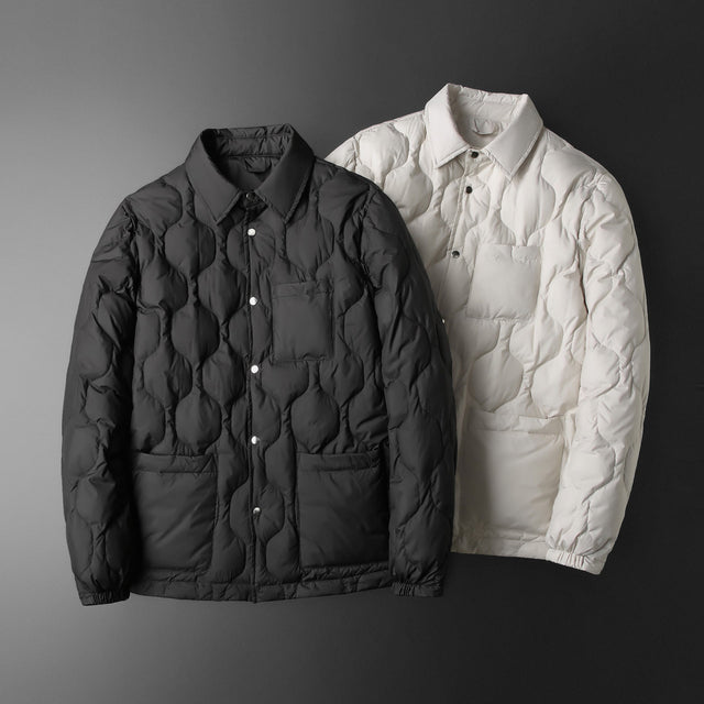 Introducing our Stephan - Parisian jacket, which features a sophisticated polo collar that exudes sophistication and charm. Designed to withstand the cold of winter, this jacket is generously filled with high quality duck down, known for its outstanding insulating properties, ensuring both warmth and style on even the coldest days.