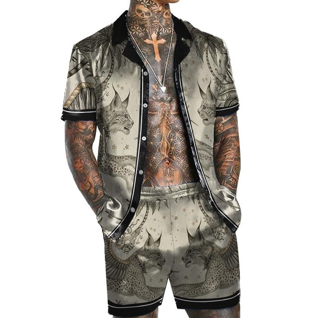 This set of winged leopard print short-sleeved shirt and shorts exudes a very summery vibe. The unique leopard print pattern brings a mysterious and wild feeling to the entire outfit. The comfortable and lightweight material is suitable for wearing in hot weather. In addition, its simple design allows it to be worn as casual daily wear, or to showcase its unique style at parties or camping activities.
