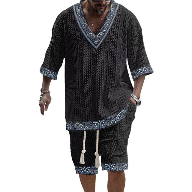 This men's knitted printed short-sleeved shorts set is a perfect addition to your wardrobe. It stands out with its unique style and exquisite printed design, exuding unparalleled fashion sense. The short sleeves and shorts design keep you comfortable in everyday life. Made from high-quality fabric, the outfit offers both softness and durability, ensuring maximum comfort during wear. Whether on a beach vacation or in the city, this outfit allows you to show off your unique personal taste.