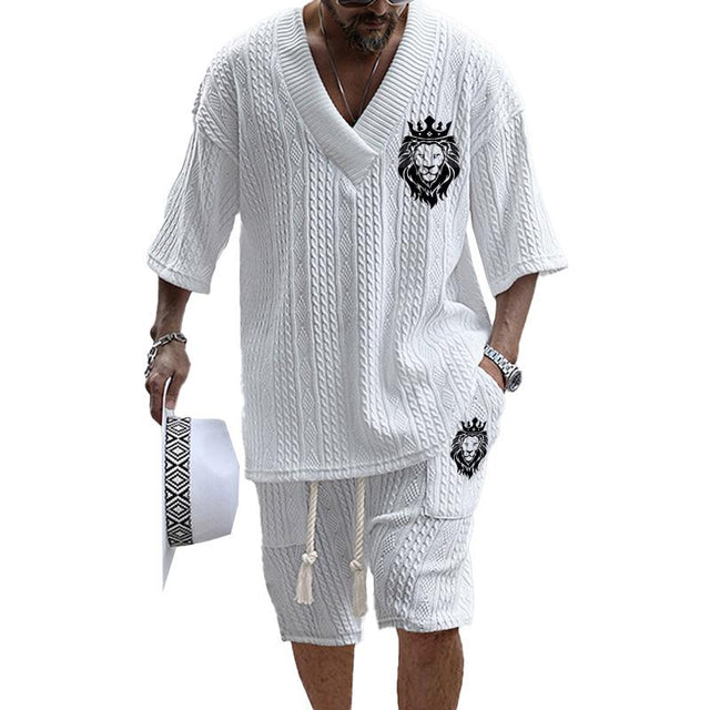 This men's knitted printed short-sleeved shorts set is a perfect addition to your wardrobe. It stands out with its unique style and exquisite printed design, exuding unparalleled fashion sense. The short sleeves and shorts design keep you comfortable in everyday life. Made from high-quality fabric, the outfit offers both softness and durability, ensuring maximum comfort during wear. Whether on a beach vacation or in the city, this outfit allows you to show off your unique personal taste.