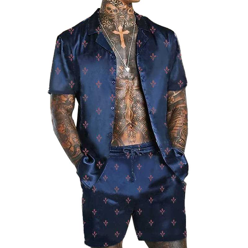 This deep blue and red printed short-sleeve shirt and shorts set is perfect for a day at the beach. The vibrant red print against the rich blue color conjures images of clear skies and crashing waves. The lightweight and comfortable material make it ideal for lounging in the sun or playing beach volleyball. The simple yet elegant design makes this set suitable for both casual outings and more formal occasions. Whether you're enjoying a tropical vacation or just a day trip to the shore, this set is a must-have for any summer wardrobe.