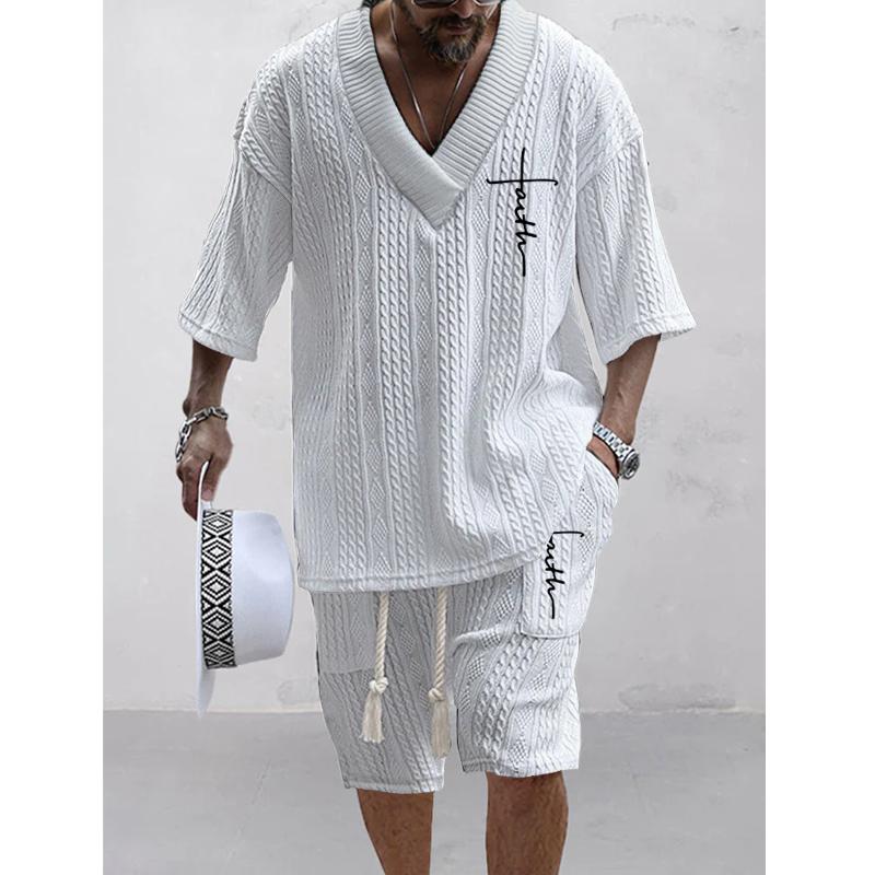 This men's knitted printed short-sleeved shorts set is a perfect addition to your wardrobe. It stands out with its unique style and exquisite printed design, exuding unparalleled fashion sense. The short sleeves and shorts design keep you comfortable in everyday life. Made from high-quality fabric, the outfit offers both softness and durability, ensuring maximum comfort during wear. Whether on a beach vacation or in the city, this outfit allows you to show off your unique personal taste.