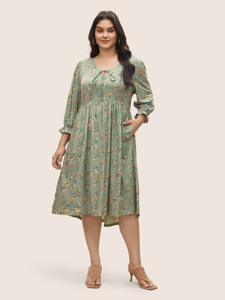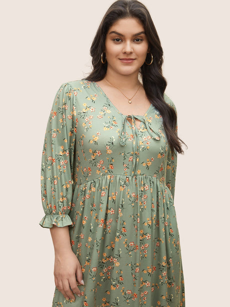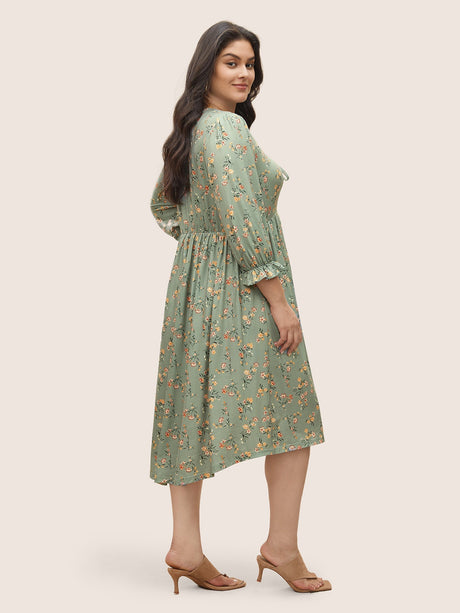 Ditsy Floral Tie Neck Flutter Sleeve Gathered Dress