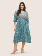 Boho Print Wrap Elastic Waist Lantern Sleeve Dress