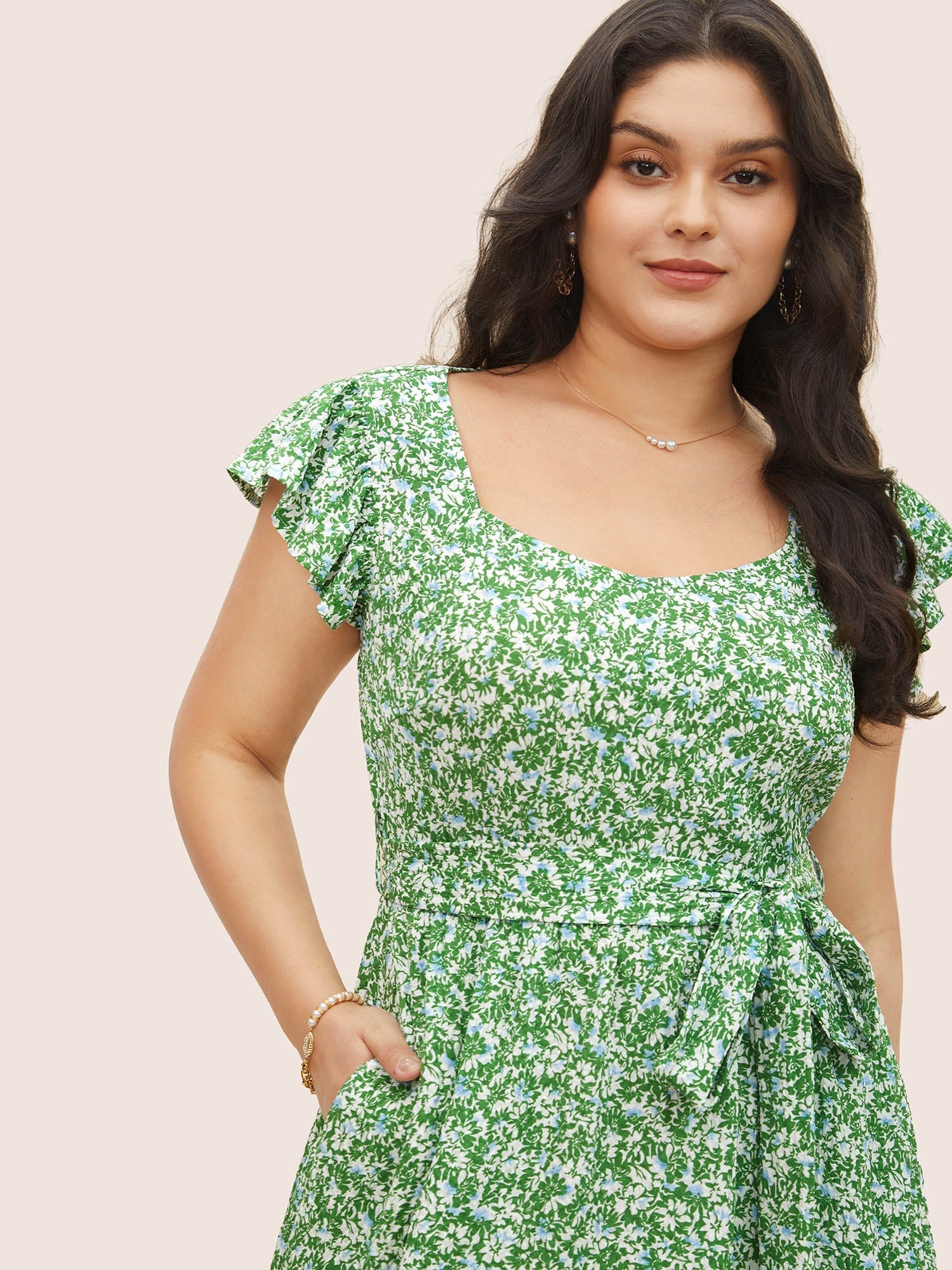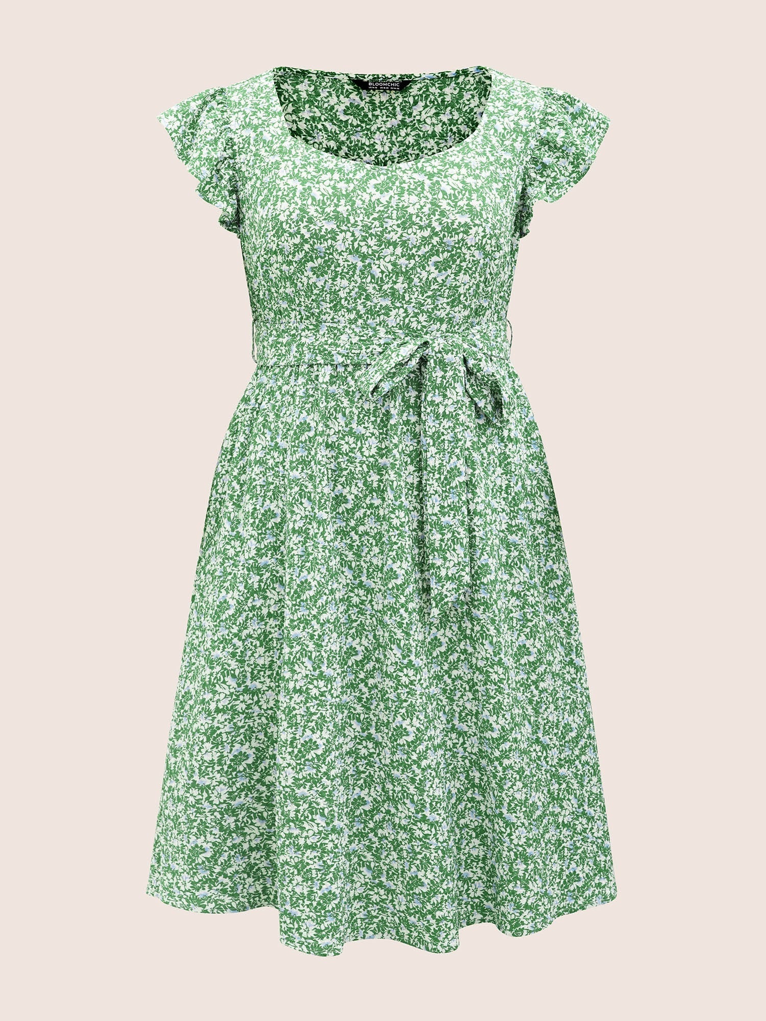 Ditsy Floral Belted Flutter Cap Sleeve Dress