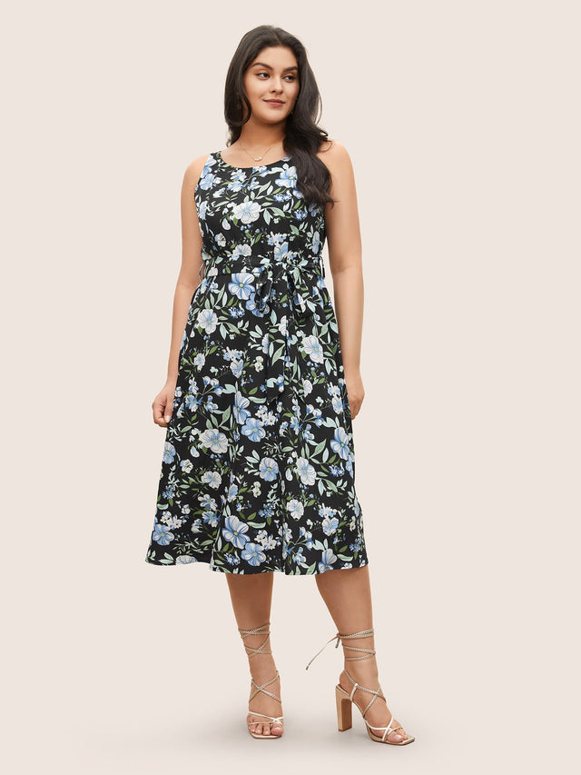 Floral Elastic Waist Sleeveless Pocket Belted Dress