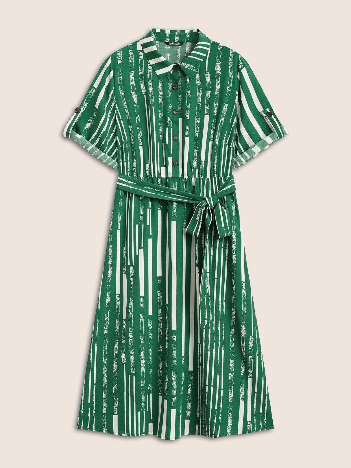 Geometric Shirt Collar Tab Sleeve Belted Dress