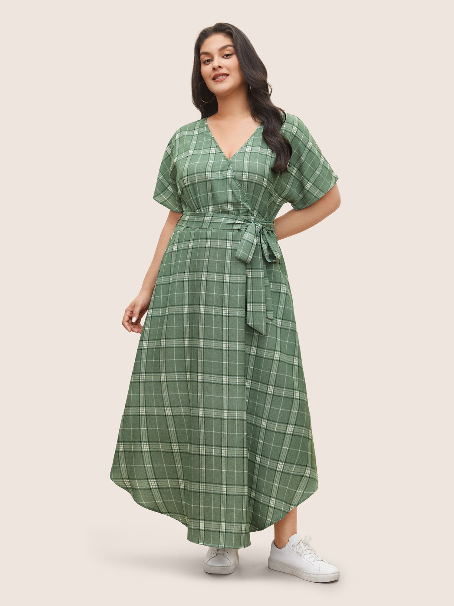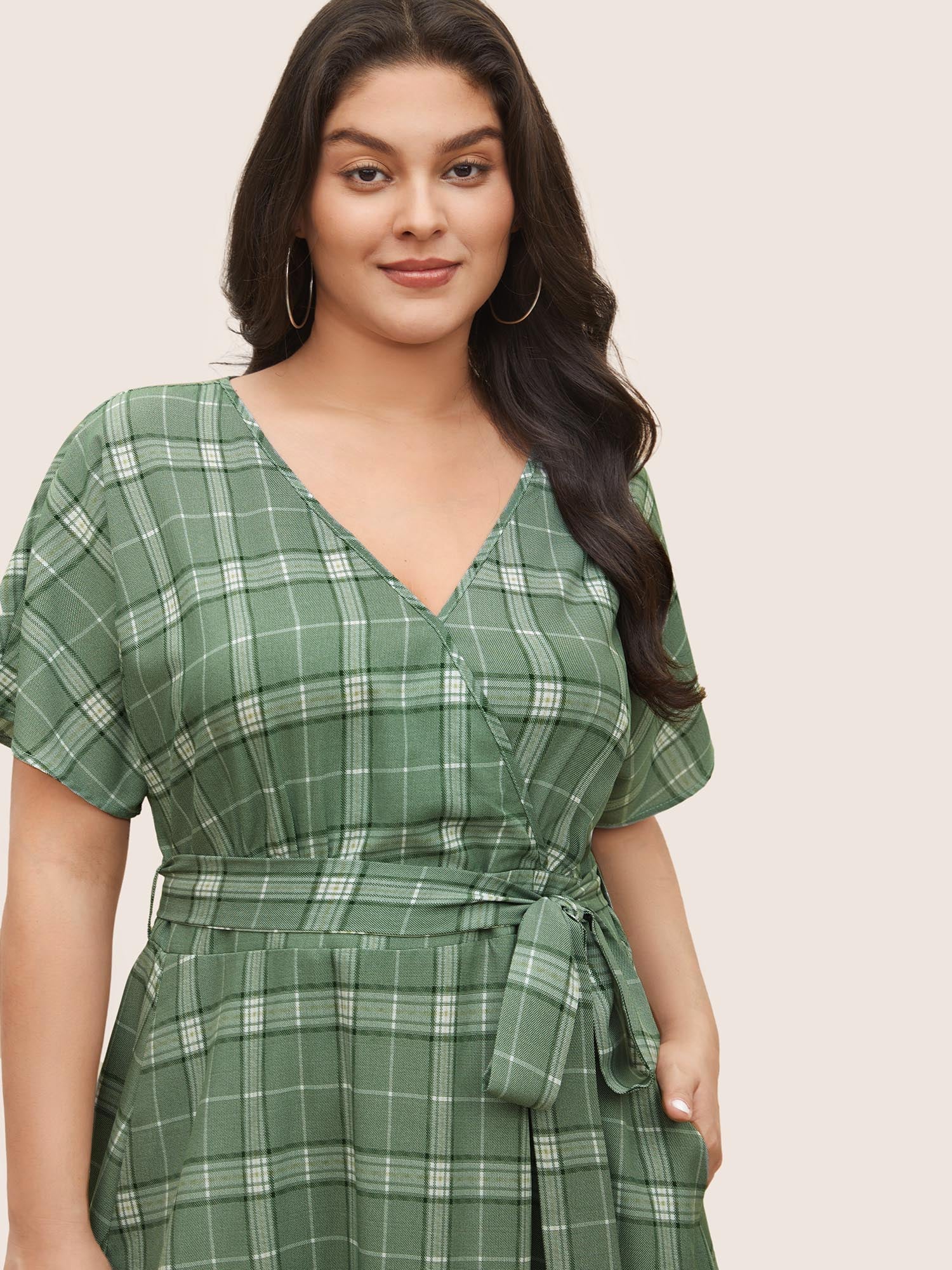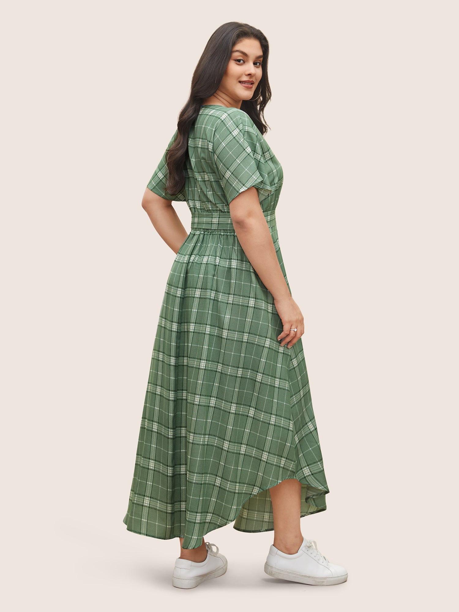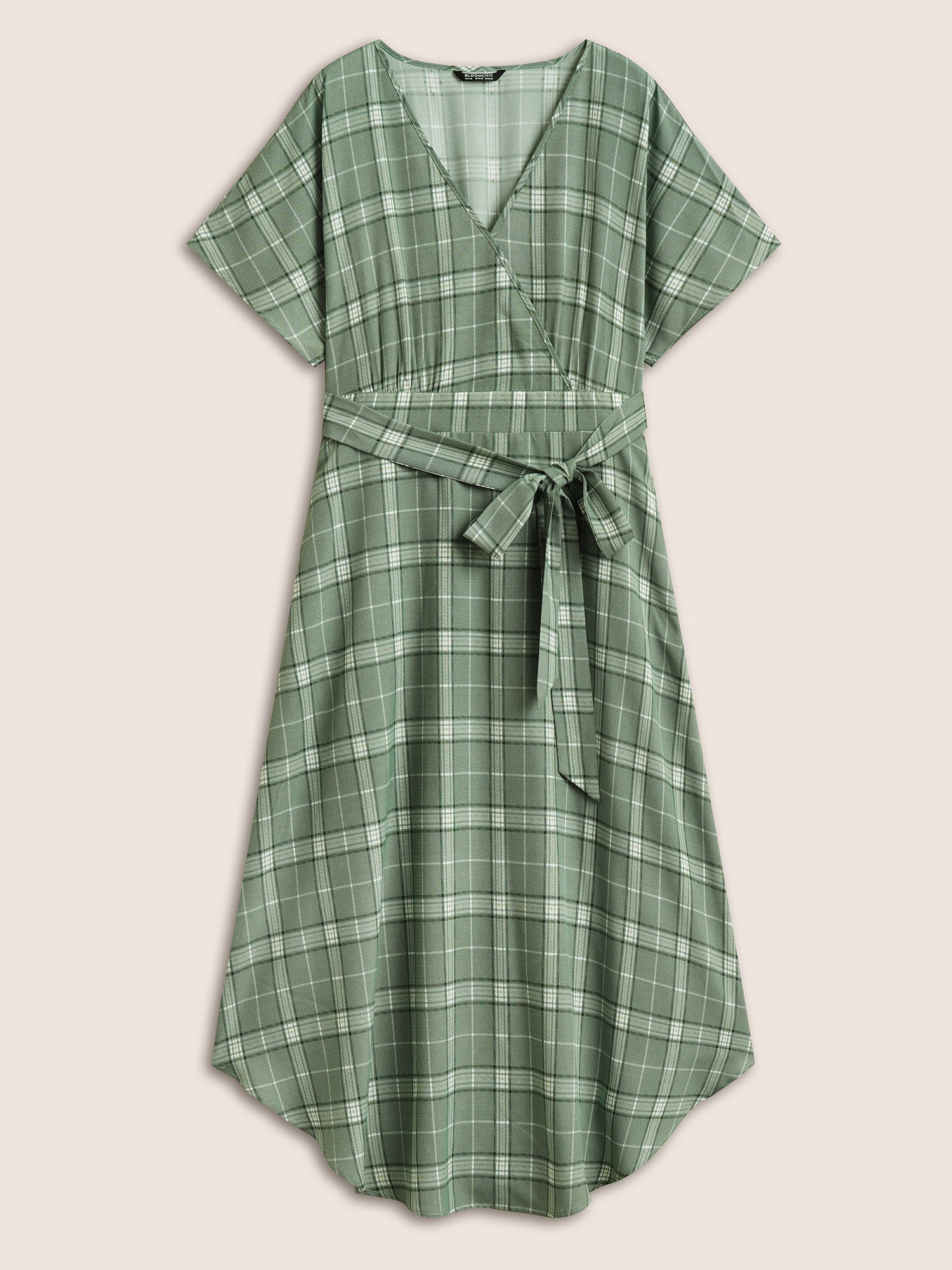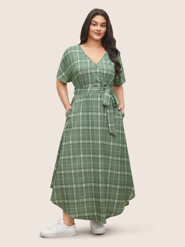 Plaid Surplice Neck Pocket Curved Hem Dress