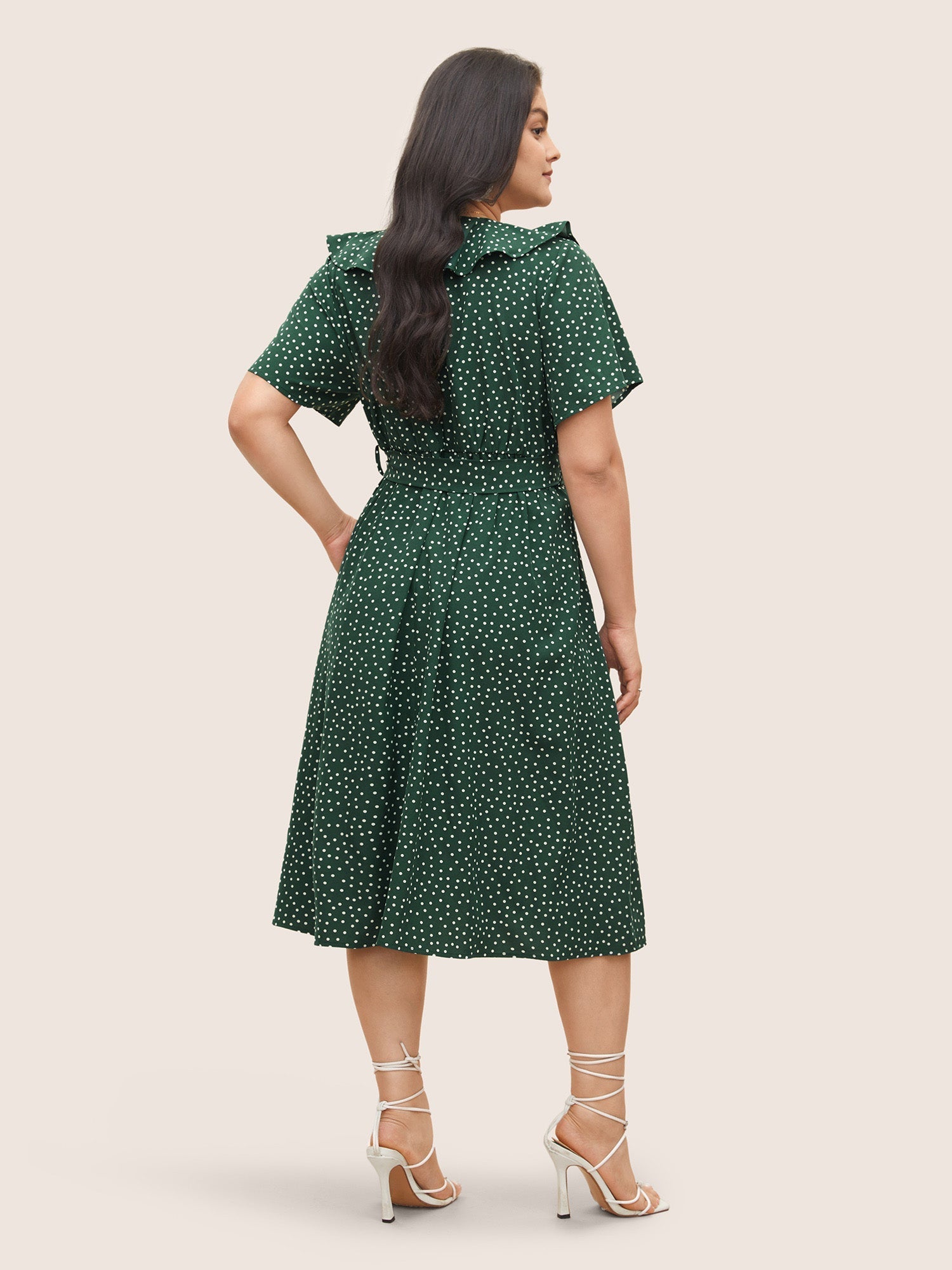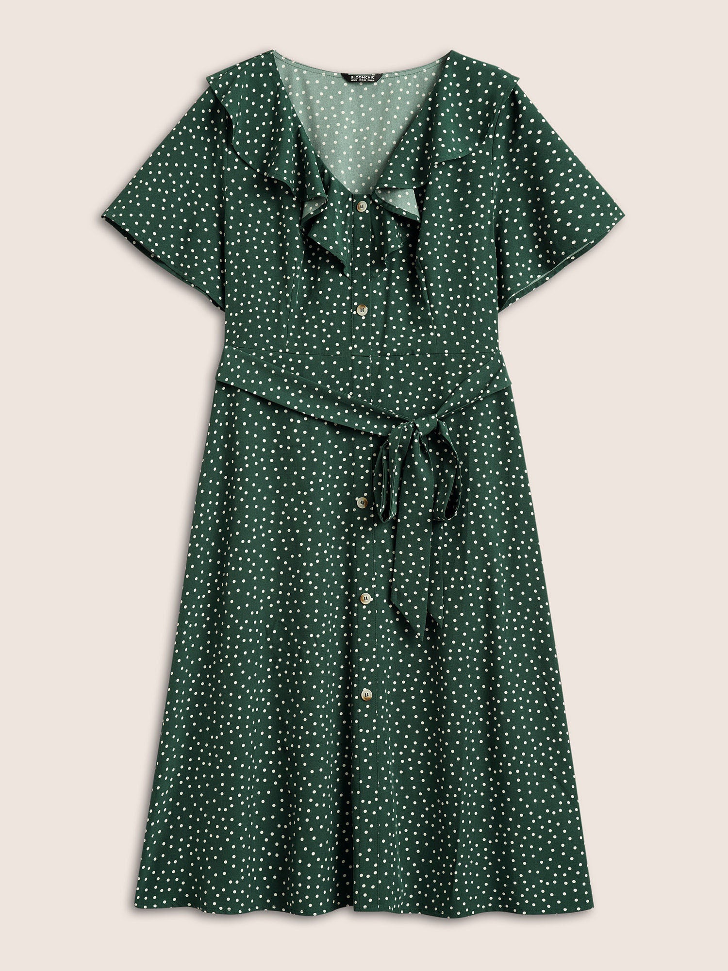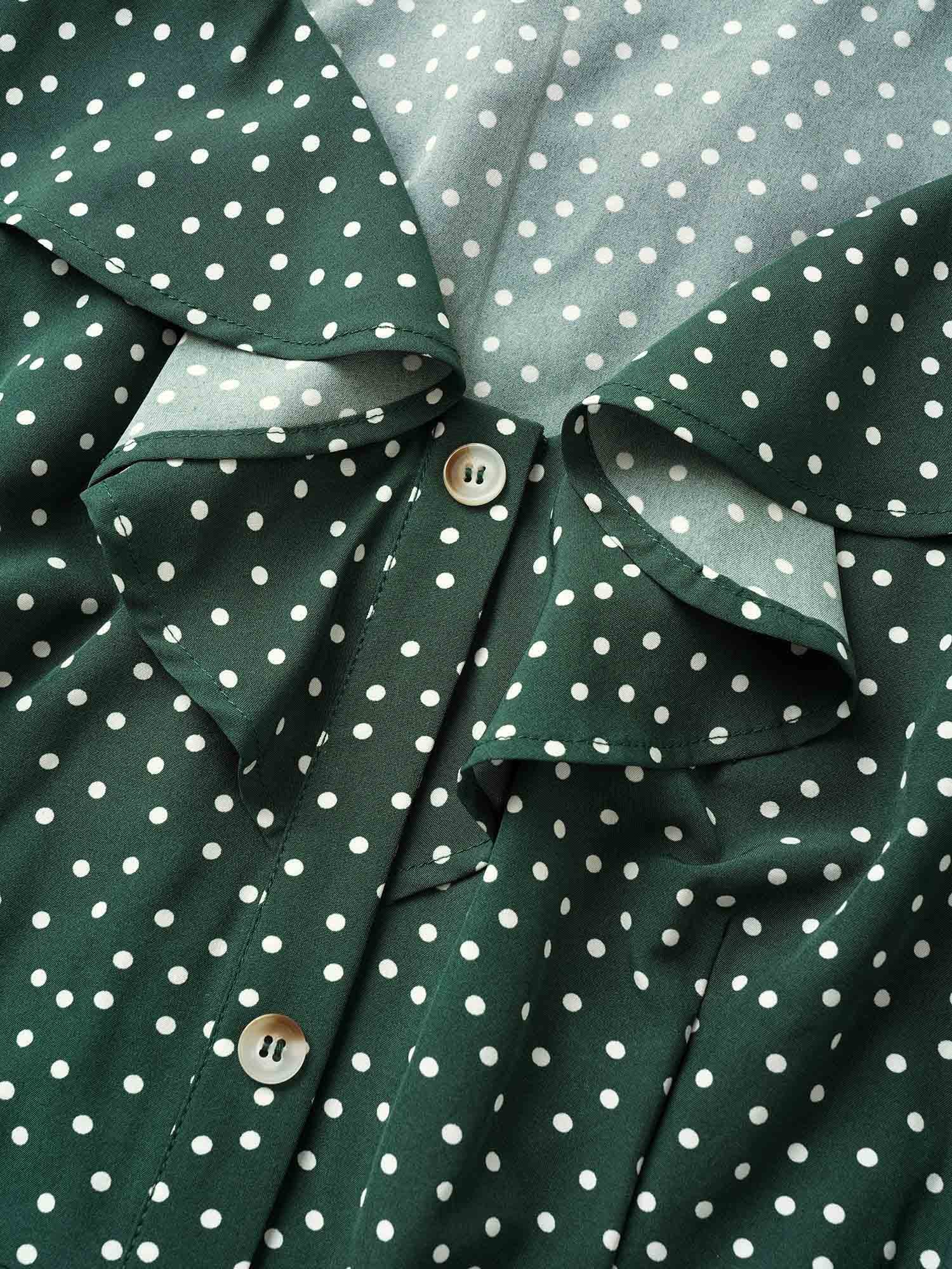 Polka Dot Flutter Trim Belted Button Detail Dress - Dark Green / 10/M is backordered and will ship as soon as it is back in stock.