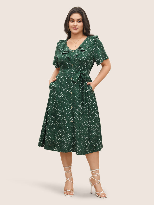 Polka Dot Flutter Trim Belted Button Detail Dress