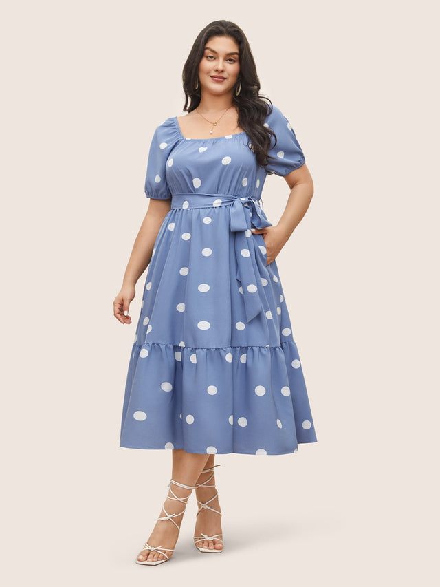 Polka Dot Gathered Belted Lantern Sleeve Dress
