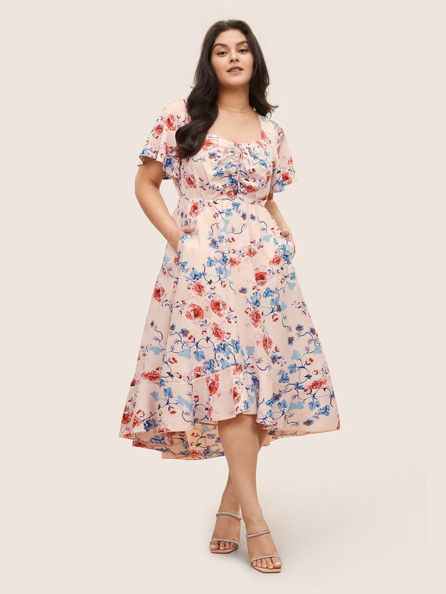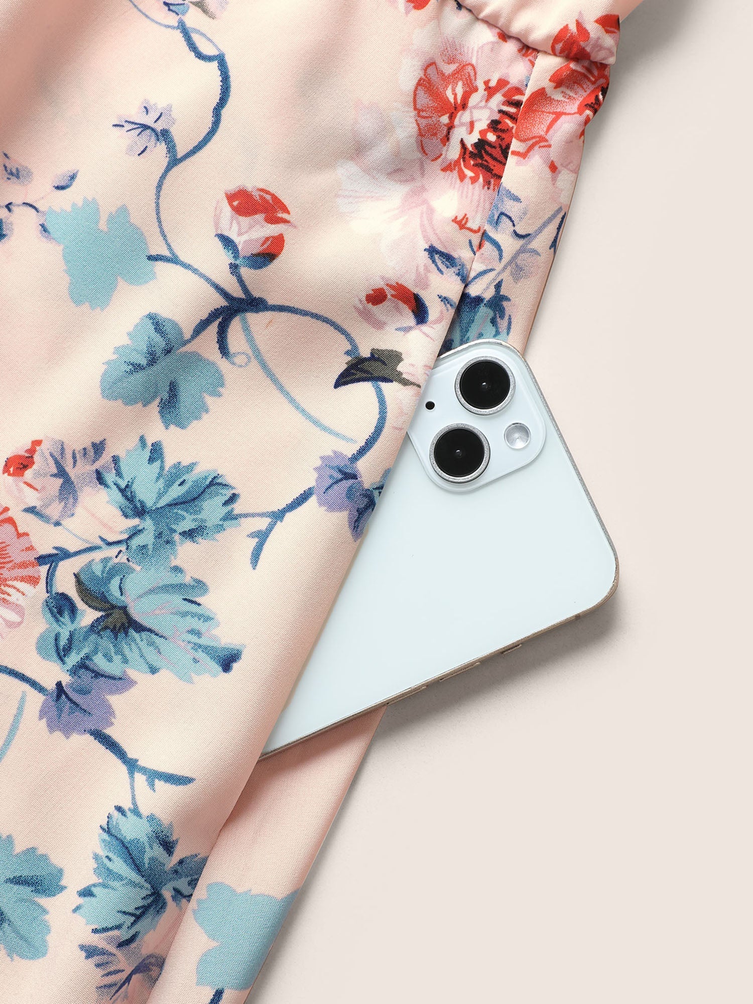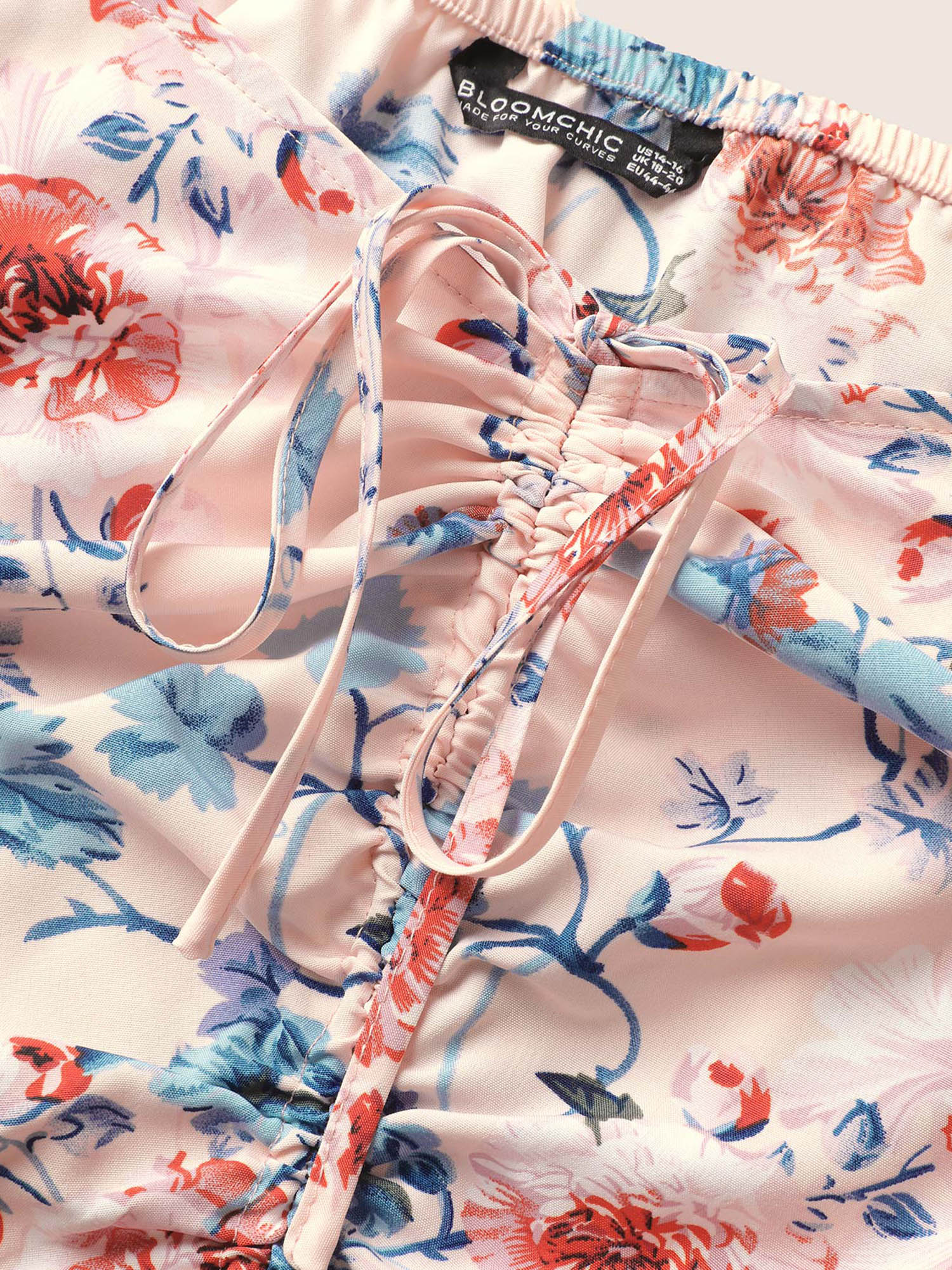 Square Neck Floral Print Gathered Drawstring Dress - Misty Rose / 10/M is backordered and will ship as soon as it is back in stock.