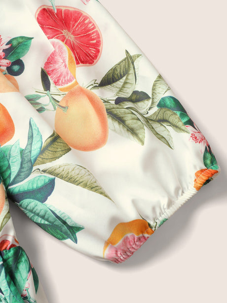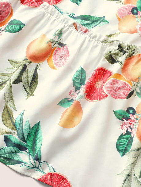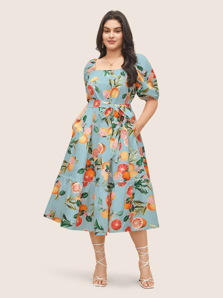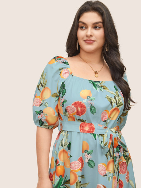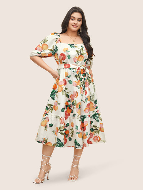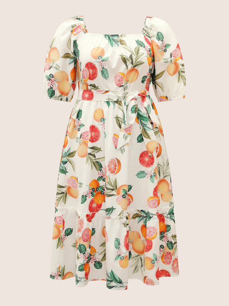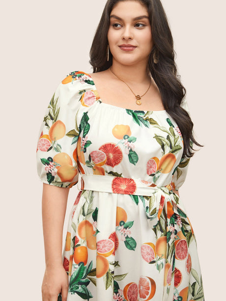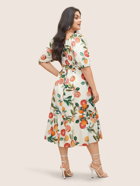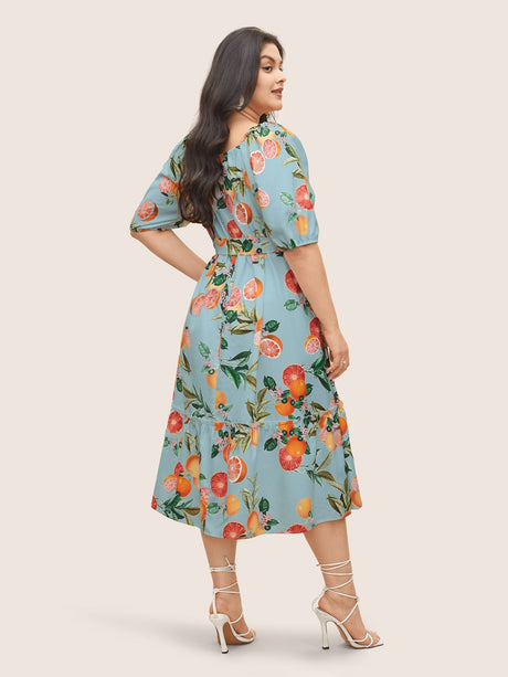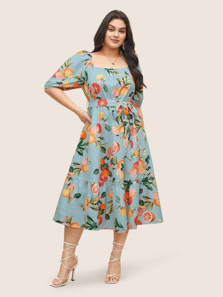 Grapefruits Print Belted Frill Trim Gathered Dress