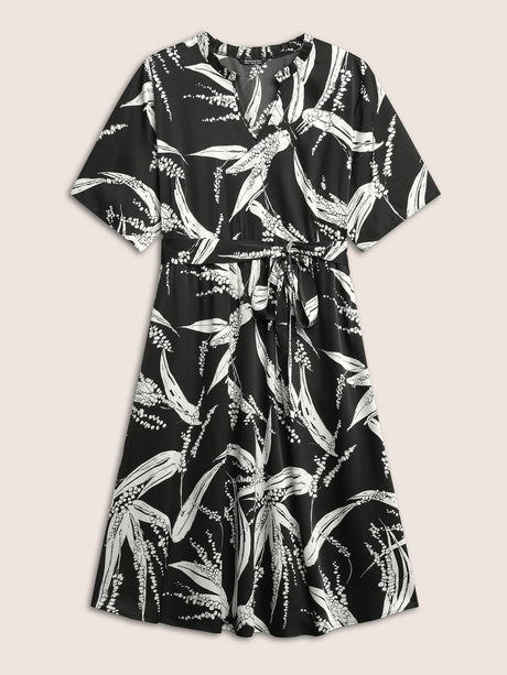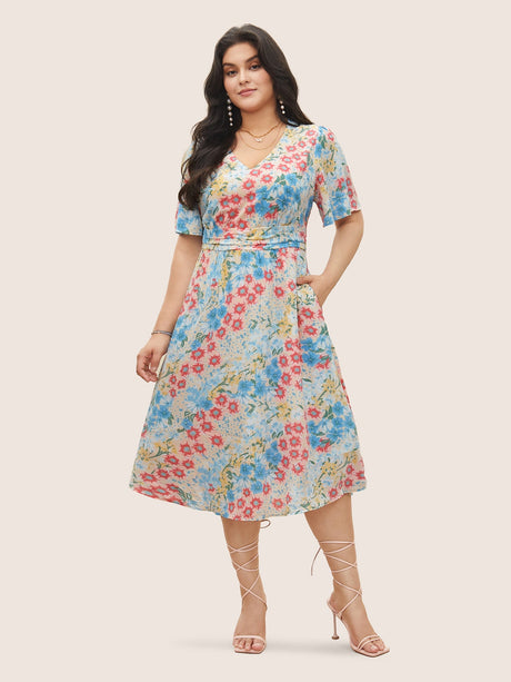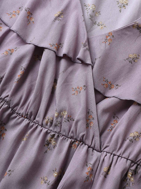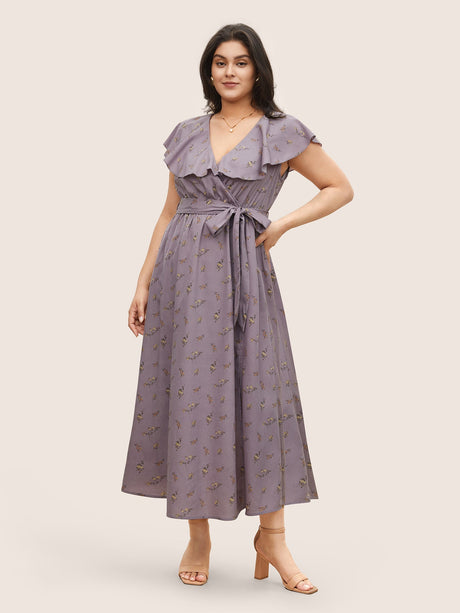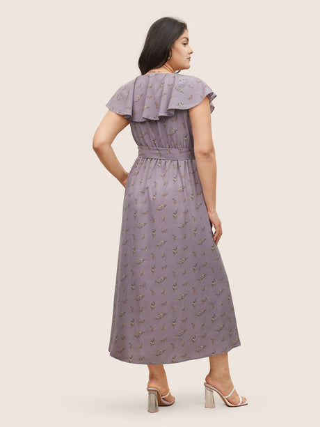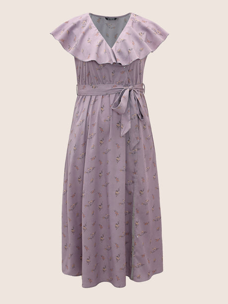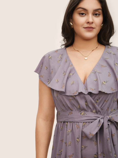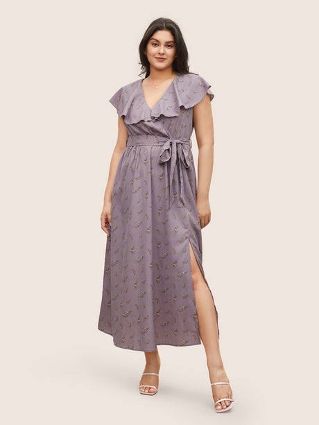 Ditsy Floral Wrap Ruffle Cap Sleeve Split Hem Dress