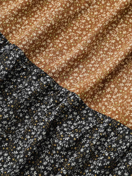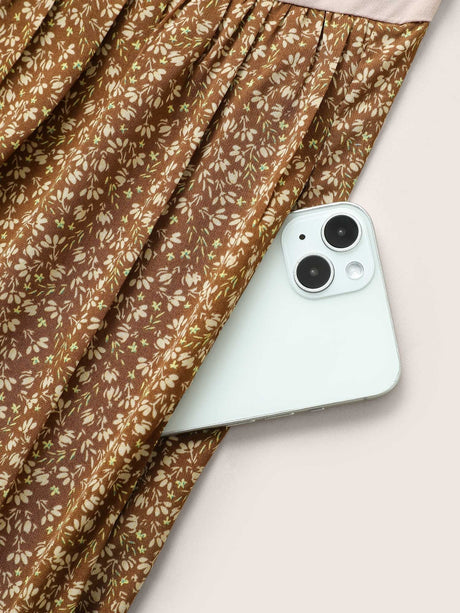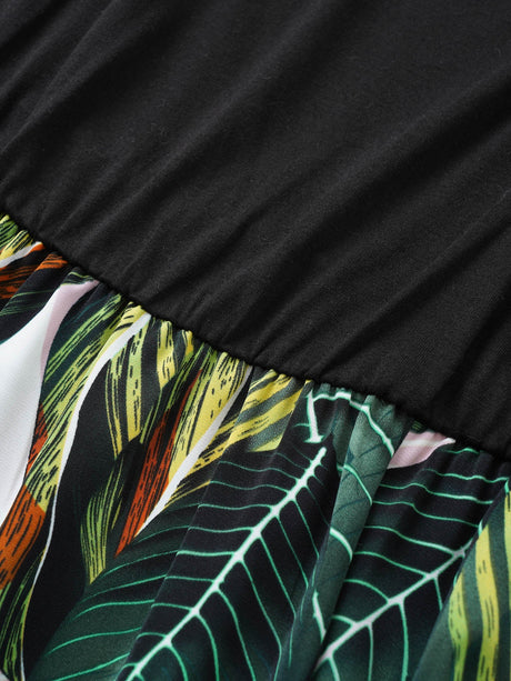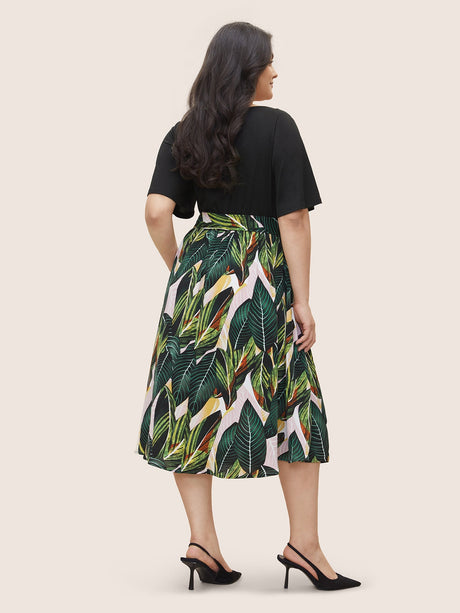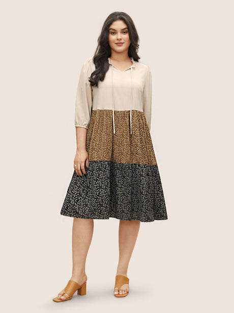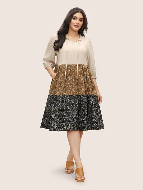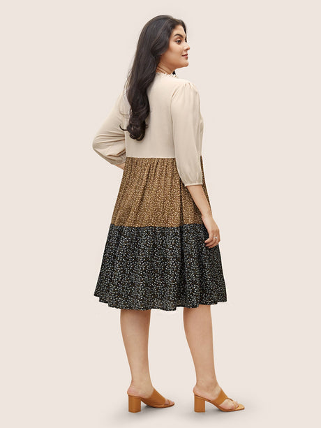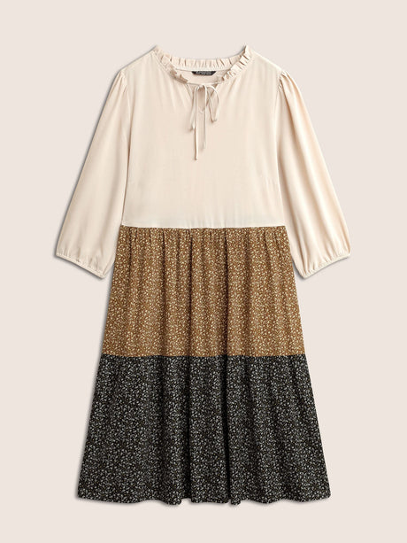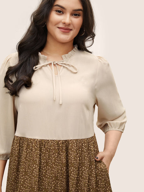 Tie Neck Ditsy Floral Colorblock Contrast Frill Trim Dress
