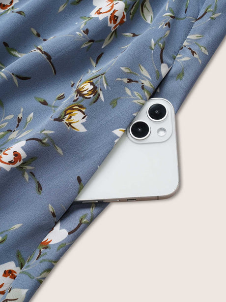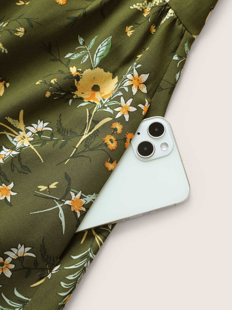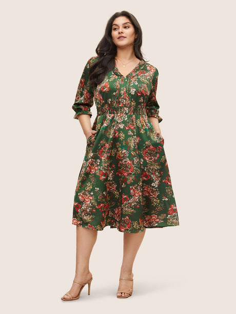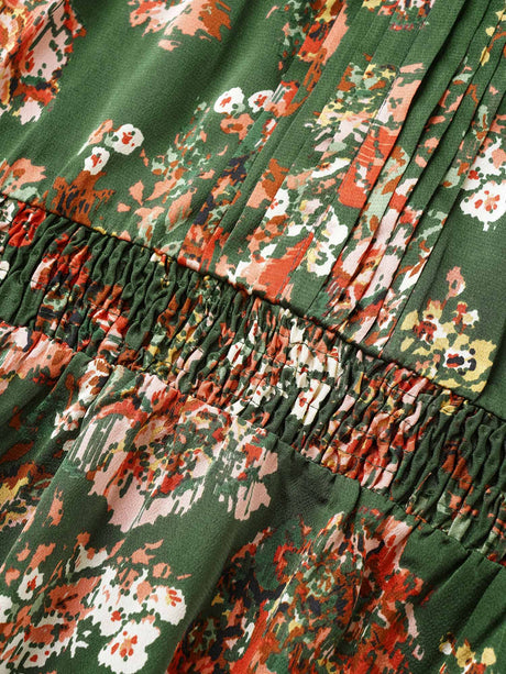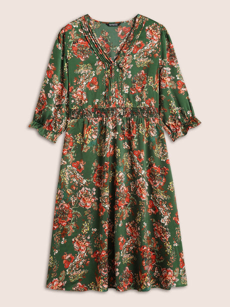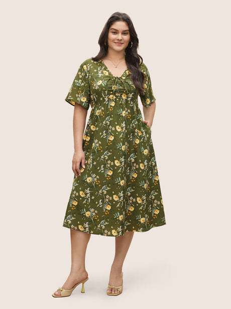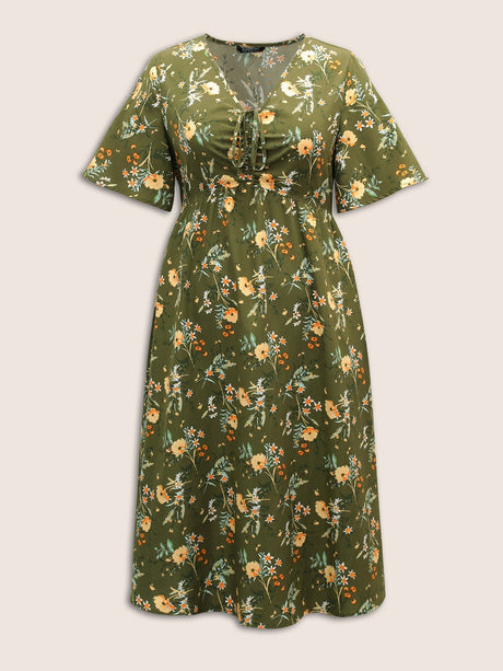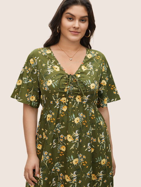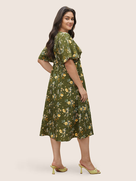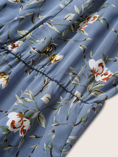 Floral Print Flutter Sleeve Shirred Pleated Dress