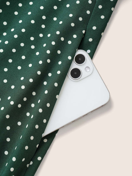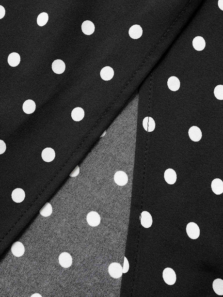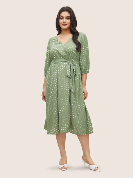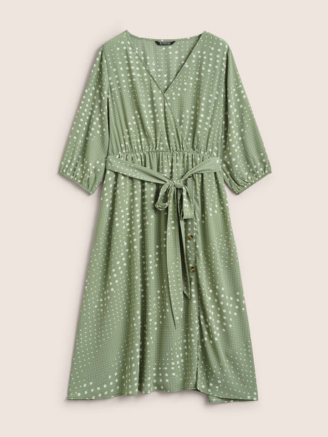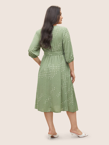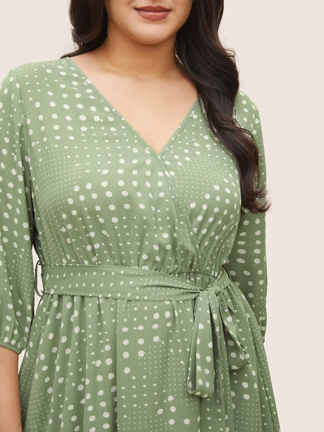 Polka Dot Overlap Collar Belted Lantern Sleeve Dress