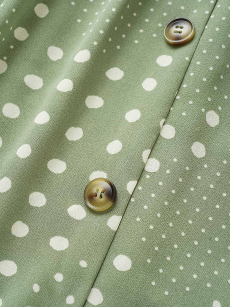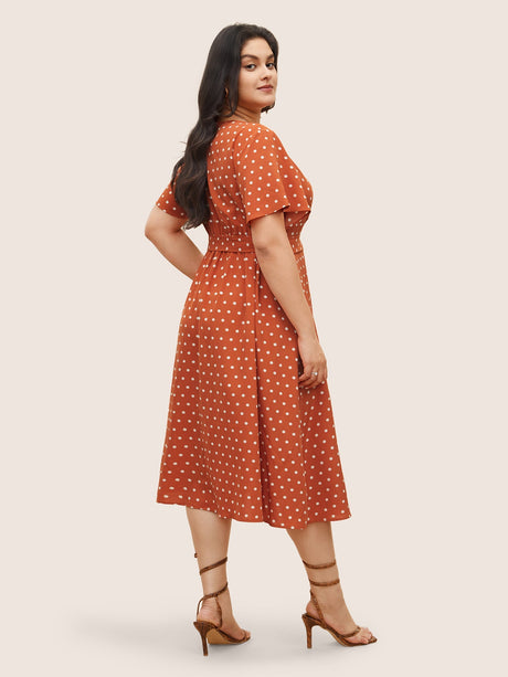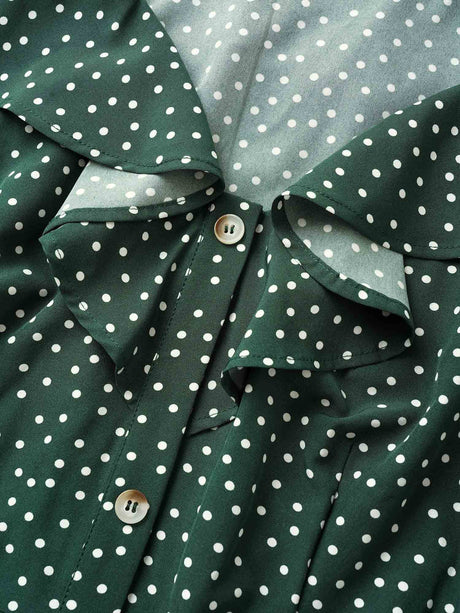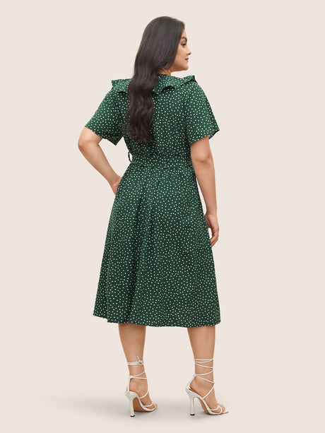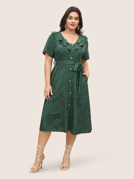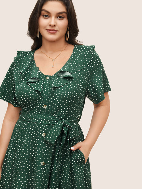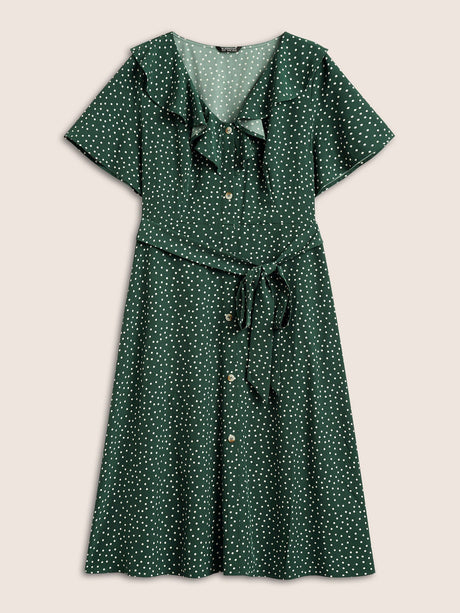 Polka Dot Flutter Trim Belted Button Detail Dress