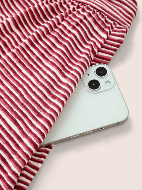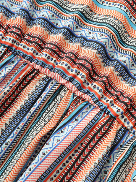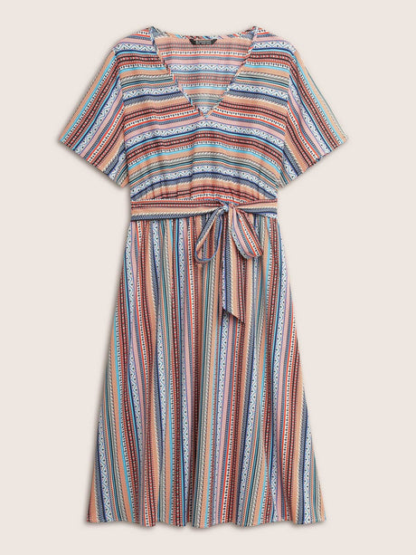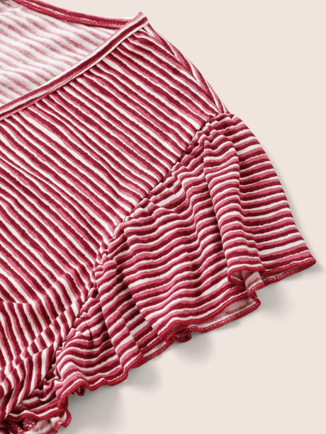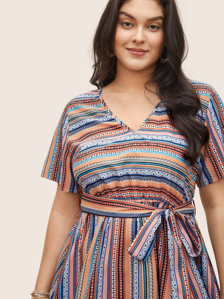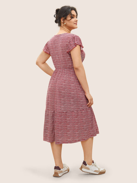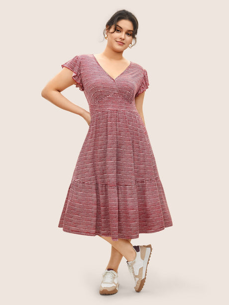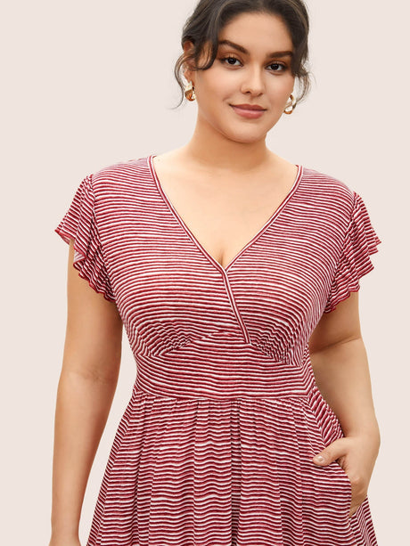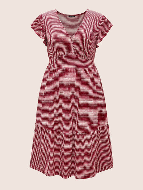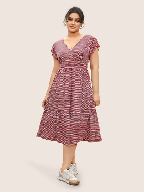Striped Surplice Neck Ruffle Cap Sleeve Dress