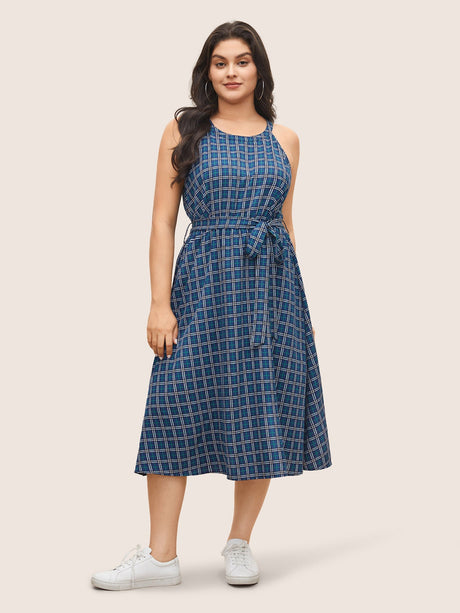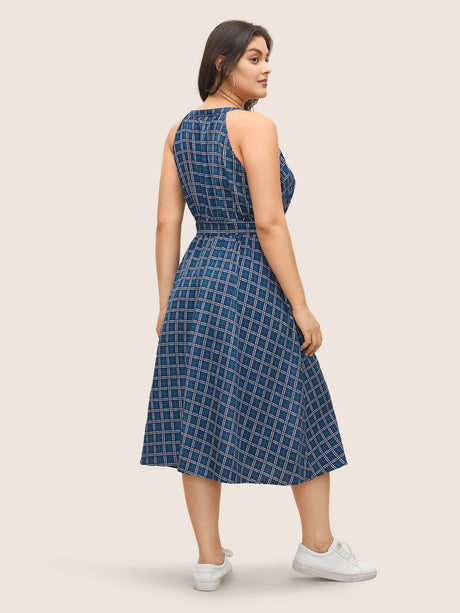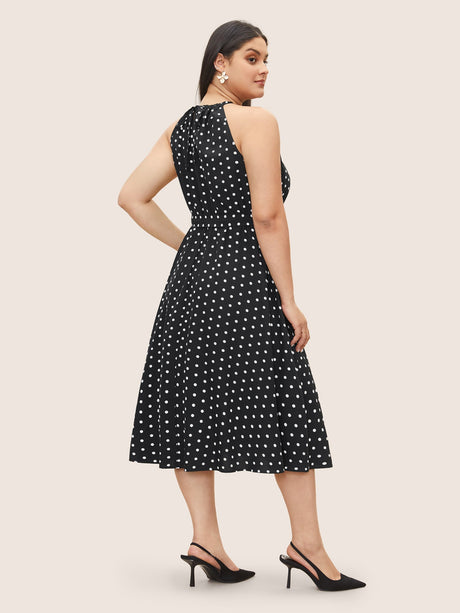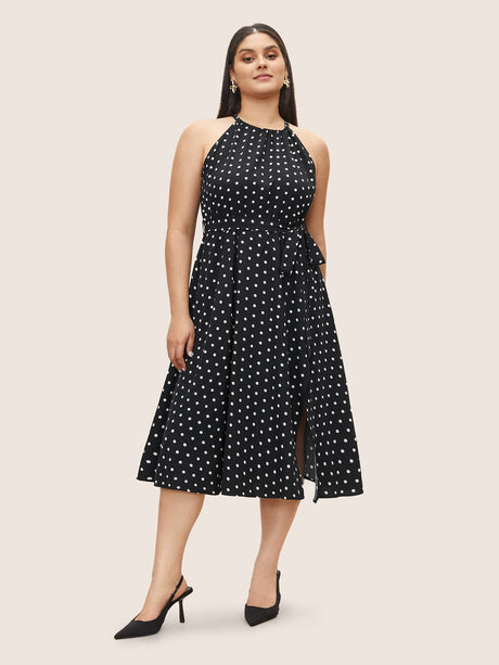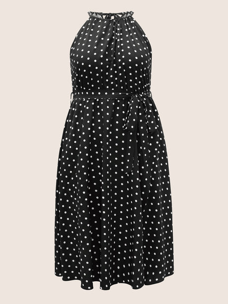 Polka Dot Halter Elastic Waist Belted Gathered Dress