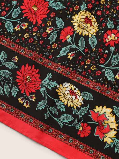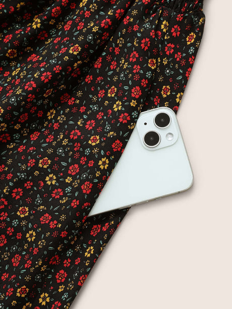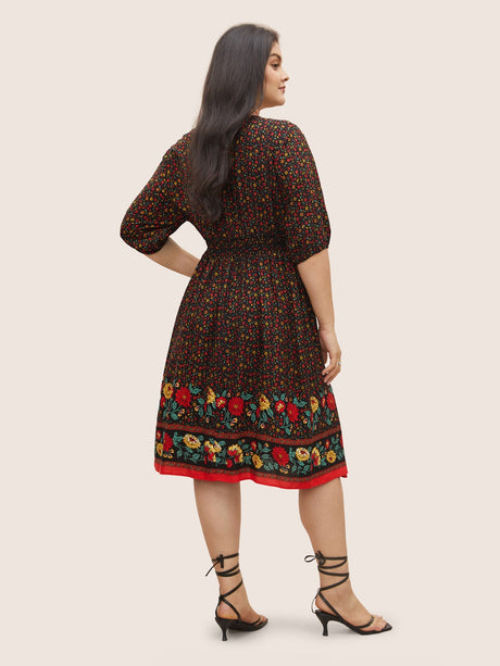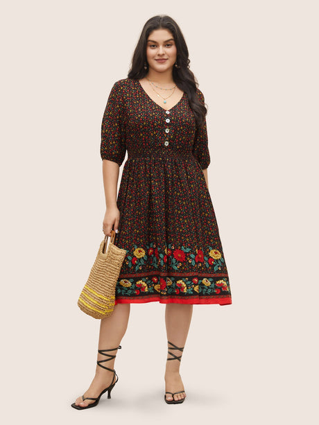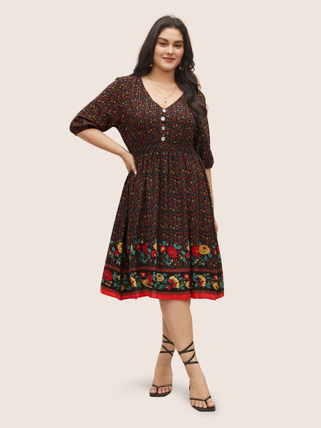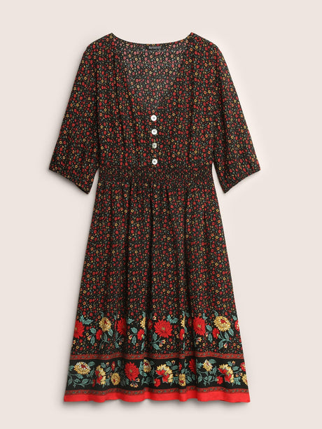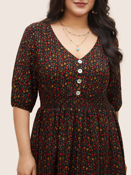 Ditsy Floral Print Elastic Waist Shirred Button Detail Dress