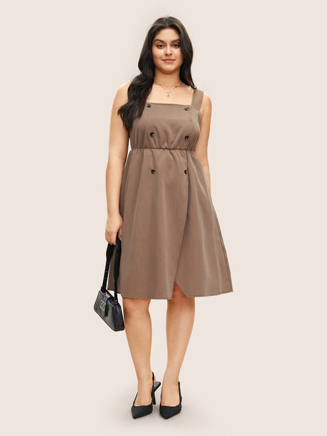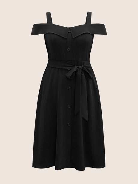 Solid Cold Shoulder Button Detail Belted Dress