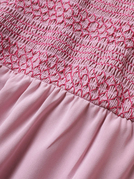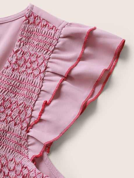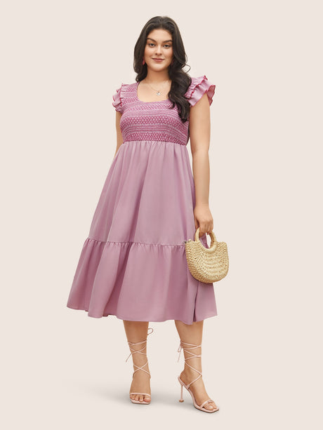 Plain Shirred Tiered Flounce Sleeve Dress