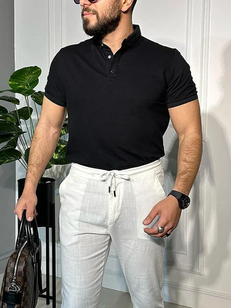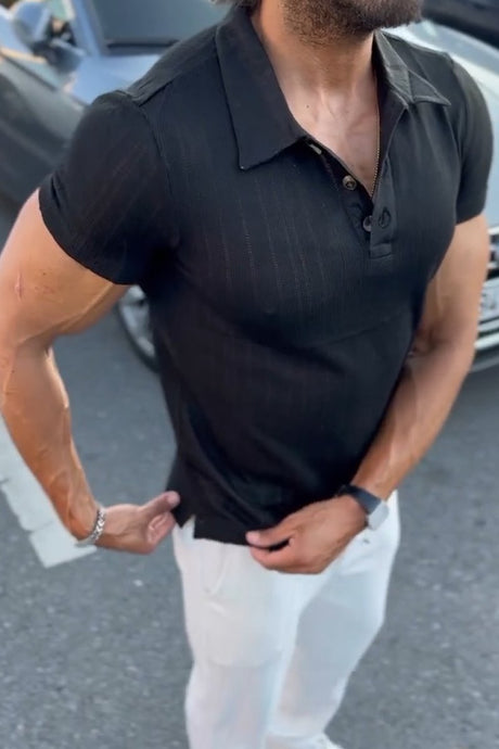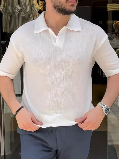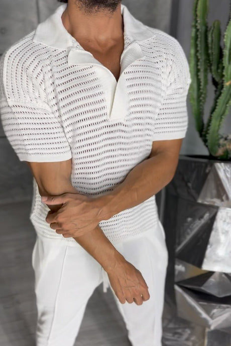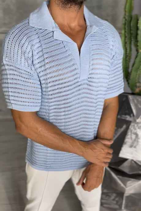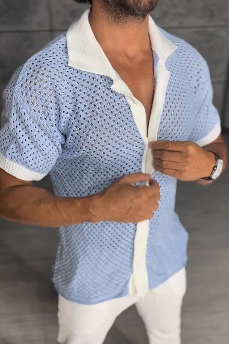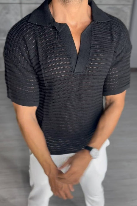 Men's Casual Hollow Contrast Lapel Knitted Polo Shirt