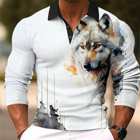 Men's Fashion Wolf 3d Printed Long Sleeve Polo Shirt