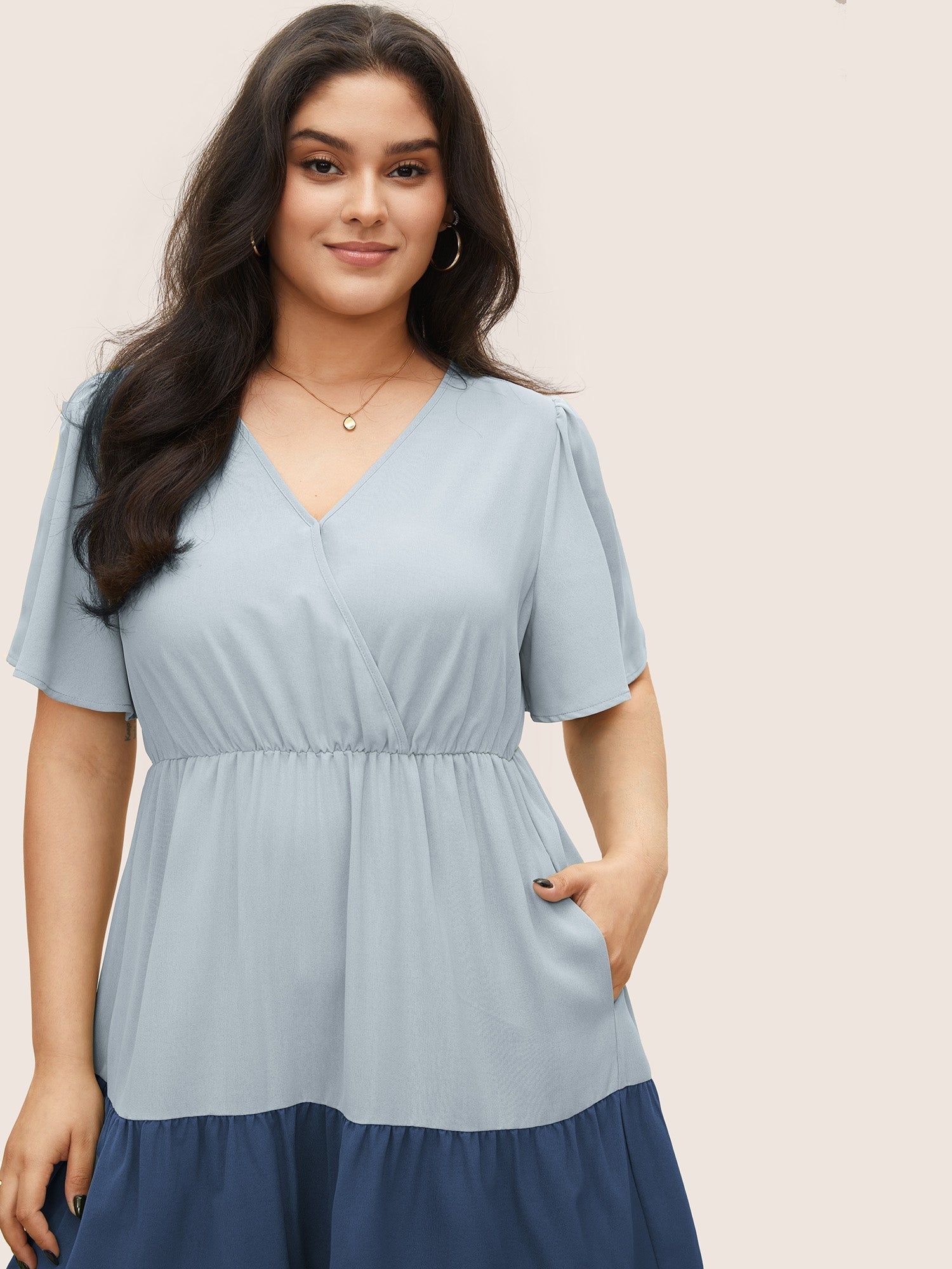 Colorblock Contrast Wrap Elastic Waist Pocket Dress