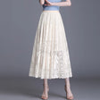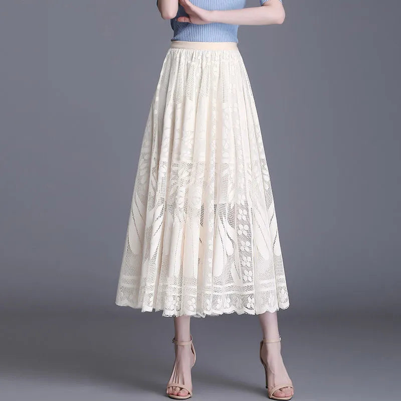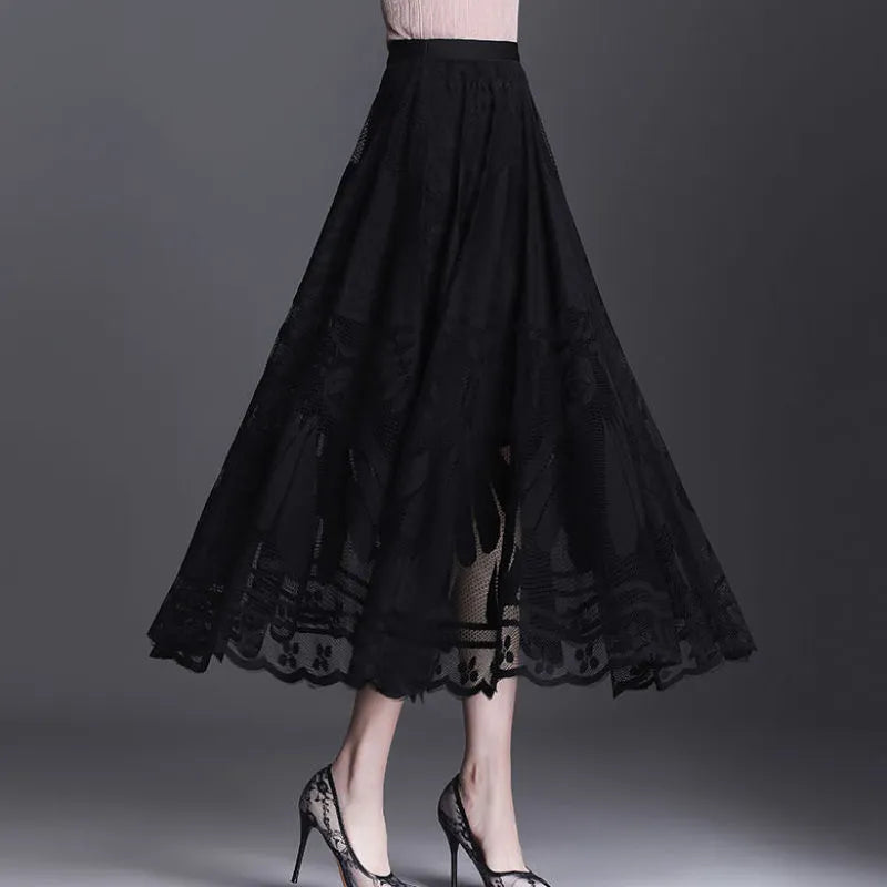 This fascinating lace skirt combines an elegant A-line with a generous swing, which is rounded off with delicate gauze and sophisticated hollow embroidery.
