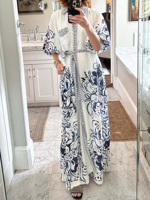 Marjorie - Linen Button Belt Long Sleeve Shirt Dress