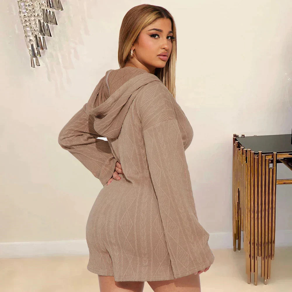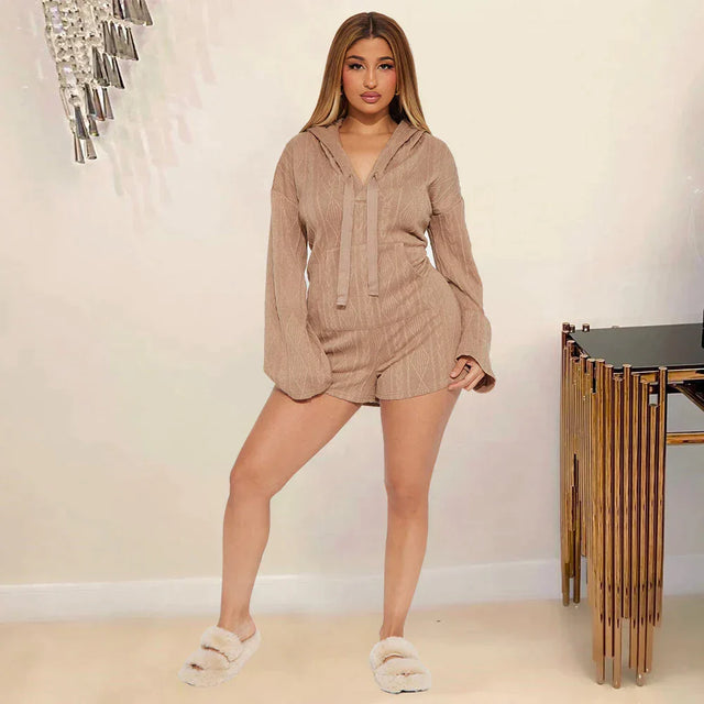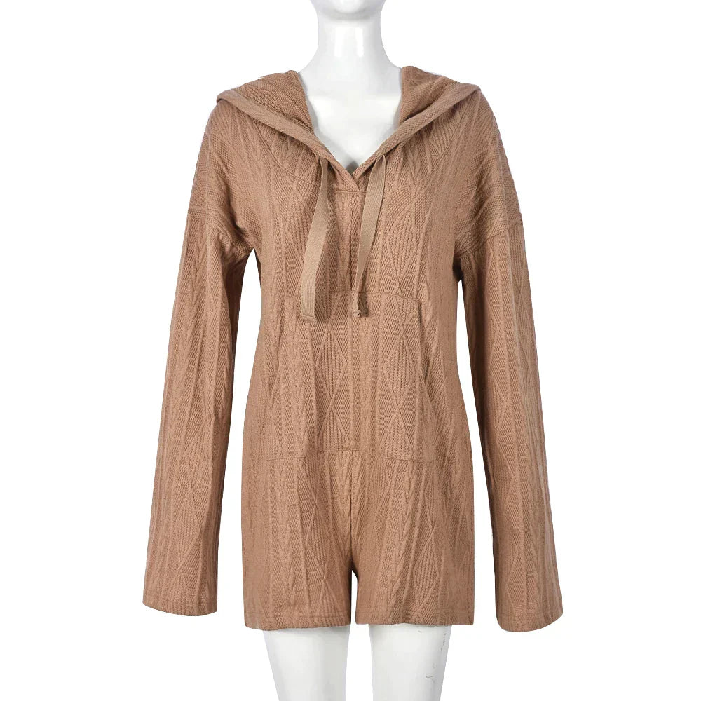 Expand your collection of cosy loungewear with this Mira - Structured hooded jumpsuit with front pockets, perfect for autumn and winter. This one-piece homewear piece combines the comfort of classic shorts with an elegant jumpsuit design. The romper features a textured knit pattern for a chic look, ideal for stylish comfort at home or casual outings.