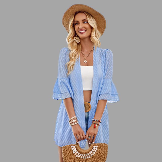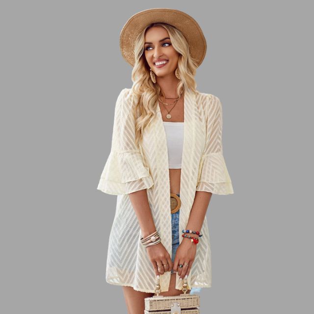 Add a touch of playful elegance to your beach wardrobe with our Rosalie - Chevron Cardigan with Flared Sleeves. Featuring delicate ruffles at the sleeves, this versatile cover-up is designed to layer effortlessly over your outfit and offers a breezy, loose fit that's ideal for strolls along the beach. Whether you're relaxing by the pool or strolling along the shore, it's the perfect piece to complete your summer look.